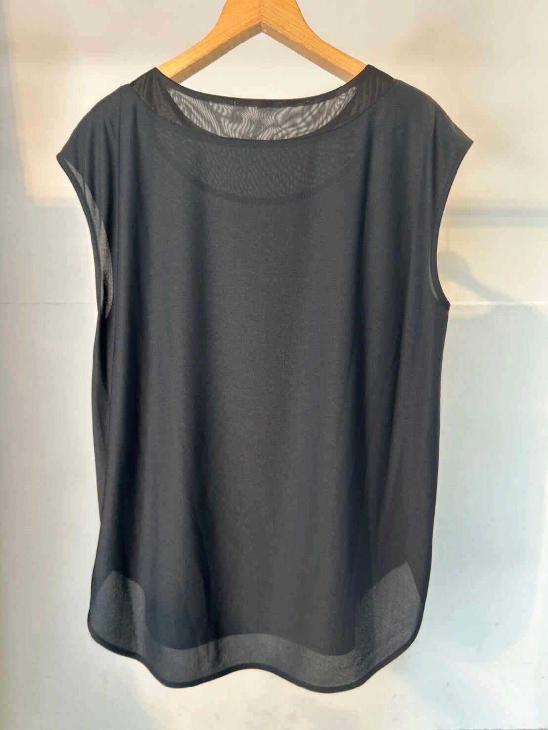 肌触りサラサラなポリエステル100%の美シルエットノースリーブプルオーバー。シンプルなデザインで、首元の切り替えデザインがさりげないアクセントに。