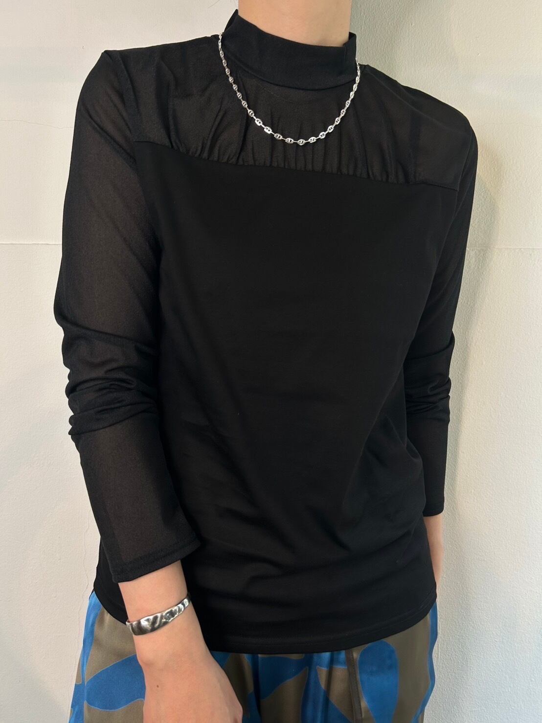 8月25日のインスタLiveでご紹介したシアードッキングカットソー。袖と胸上がシアー素材で身頃は伸縮性抜群のカットソー素材。シンプルなデザインですが異素材が可愛いカットソーです。