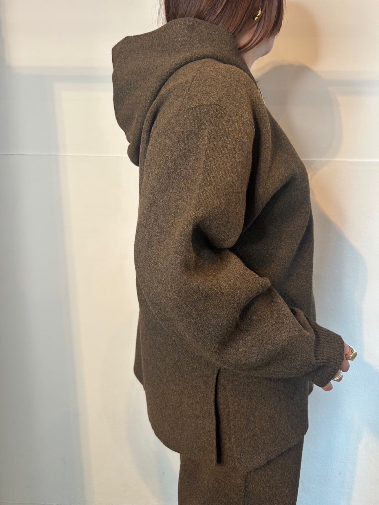 11月17日のインスタライブでご紹介したニットフードパーカー。ニット素材でスウェットのようにカジュアルなりすぎないので、大人っぽく着用頂けます。素材はもっちりなめらかな手触りで、ストレッチ性もあるので着心地◎しっかりしたニット素材で、フードの形も立体的なきれいな形に。