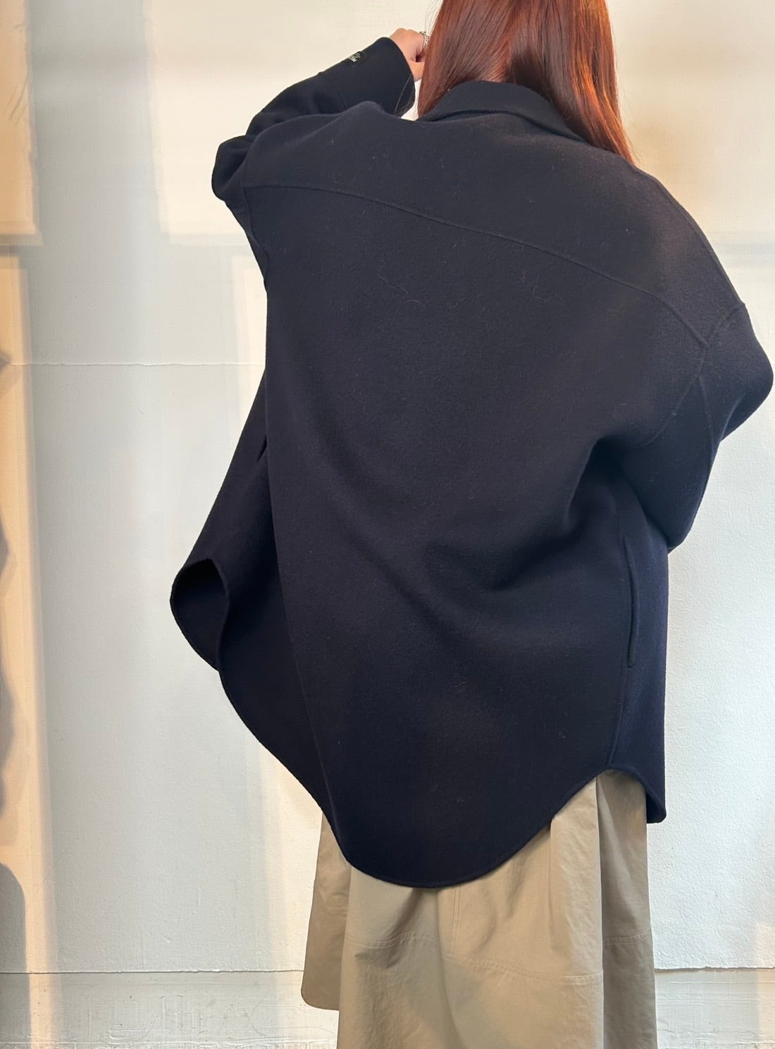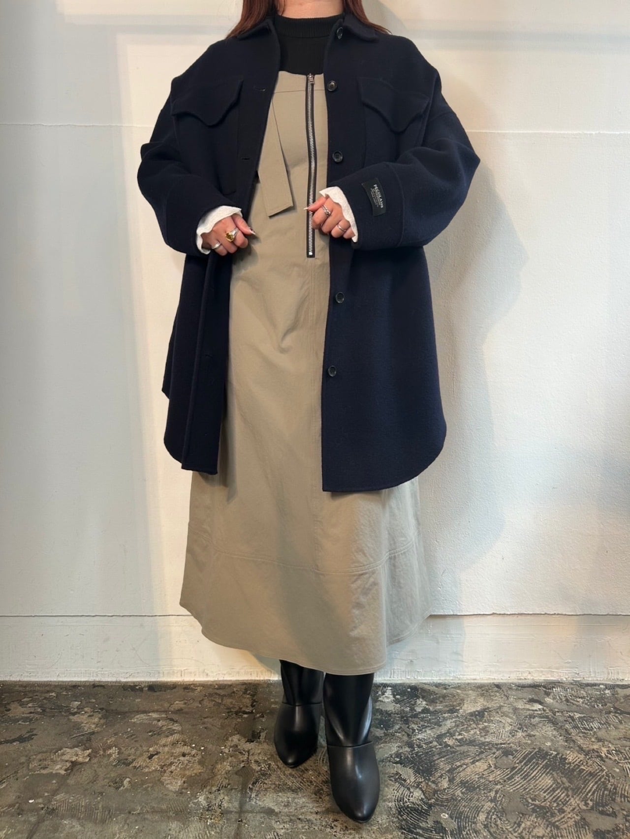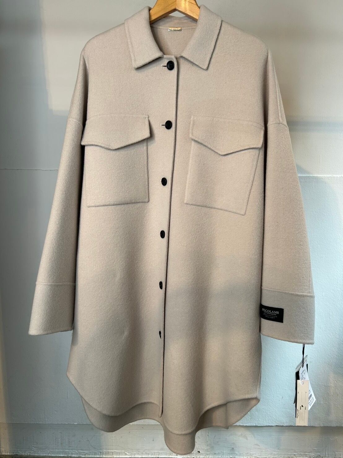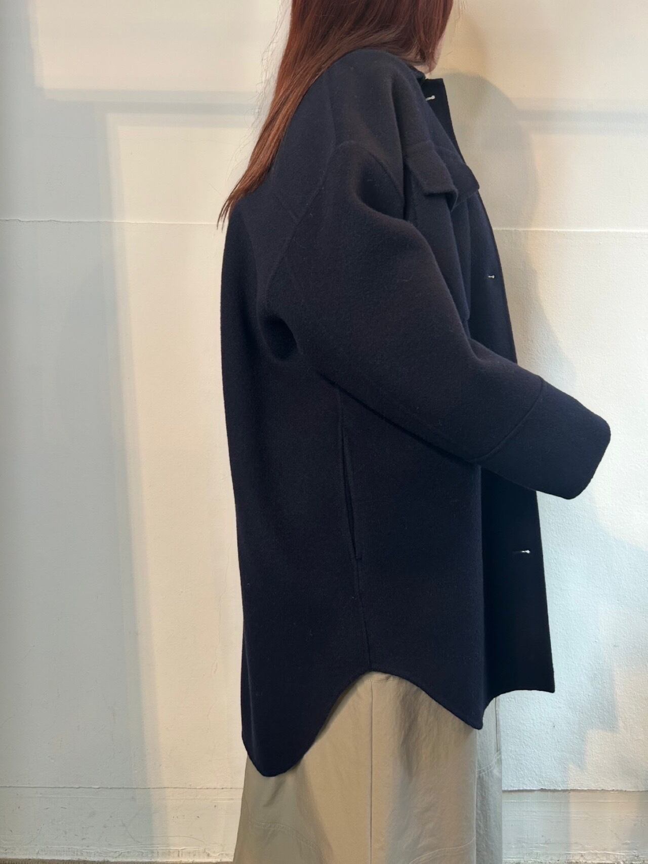 12月9日のインスタライブでご紹介したダブルフェイスCPOシャツコート。メイドインジャパンのウールカシミヤ素材、PECOLAMB(ペコラム)を使用。SUPER原料を使用している為、暖かさと軽さのある二重織ビーバー仕上げの生地。