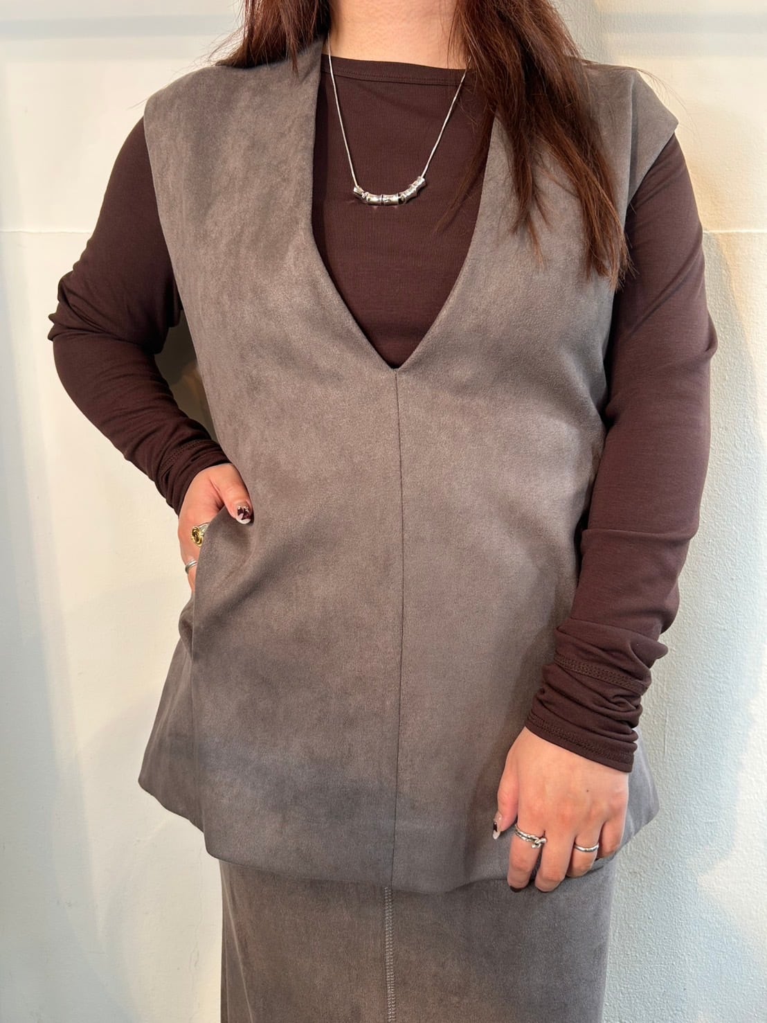 12月16日のインスタライブにてご紹介したスエードジレ。高級感と独特の温かみのあるスエード生地を用いた、着回しに便利なエコスエード素材の深Vネックジレ。同素材のスカートとセットアップも可能です◎