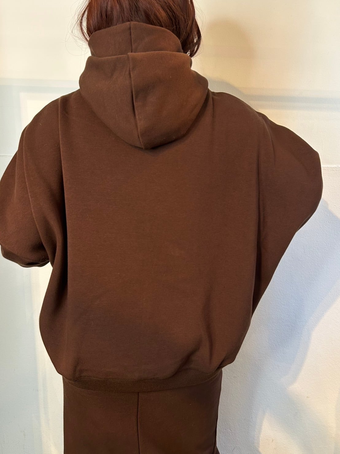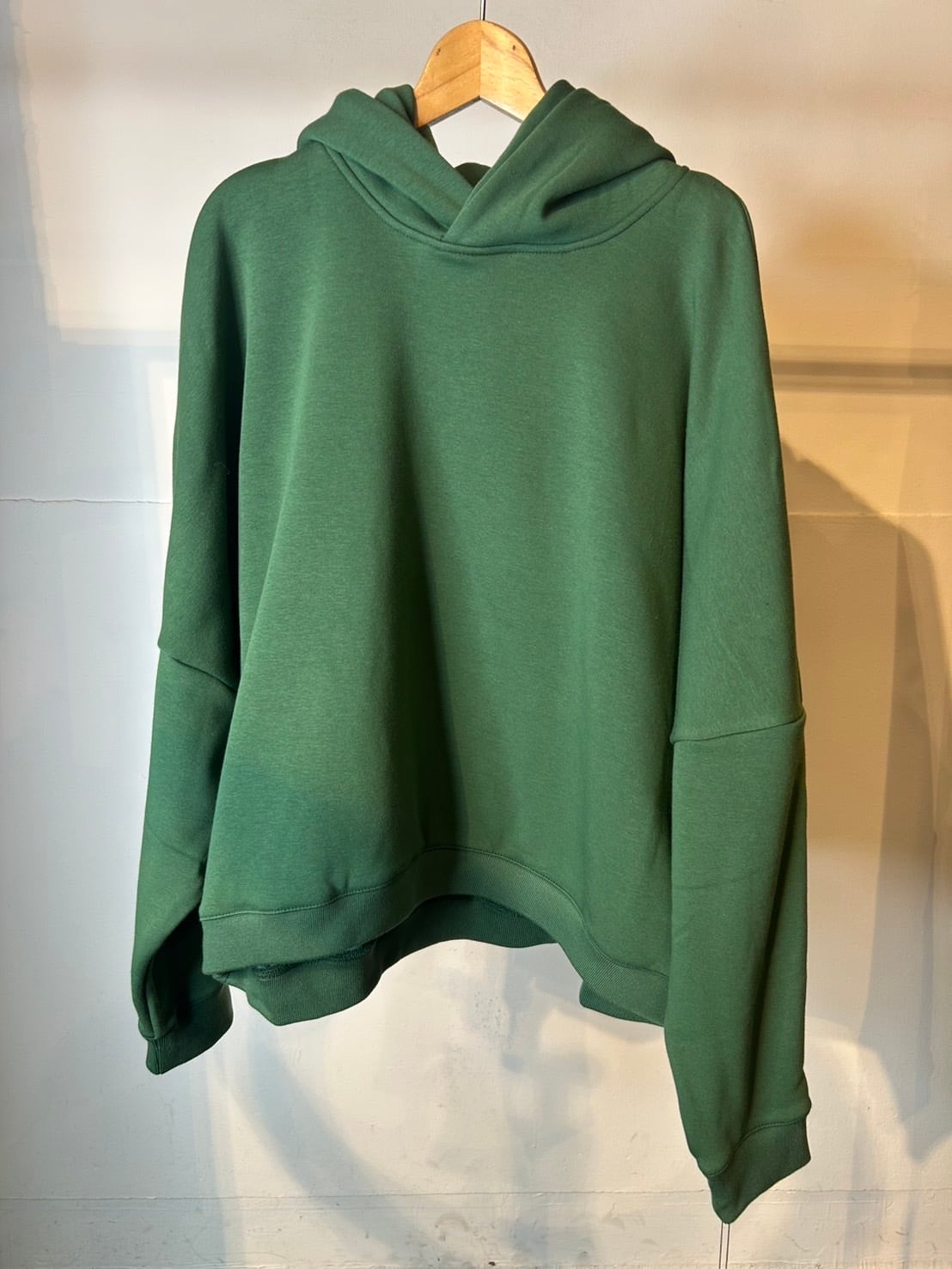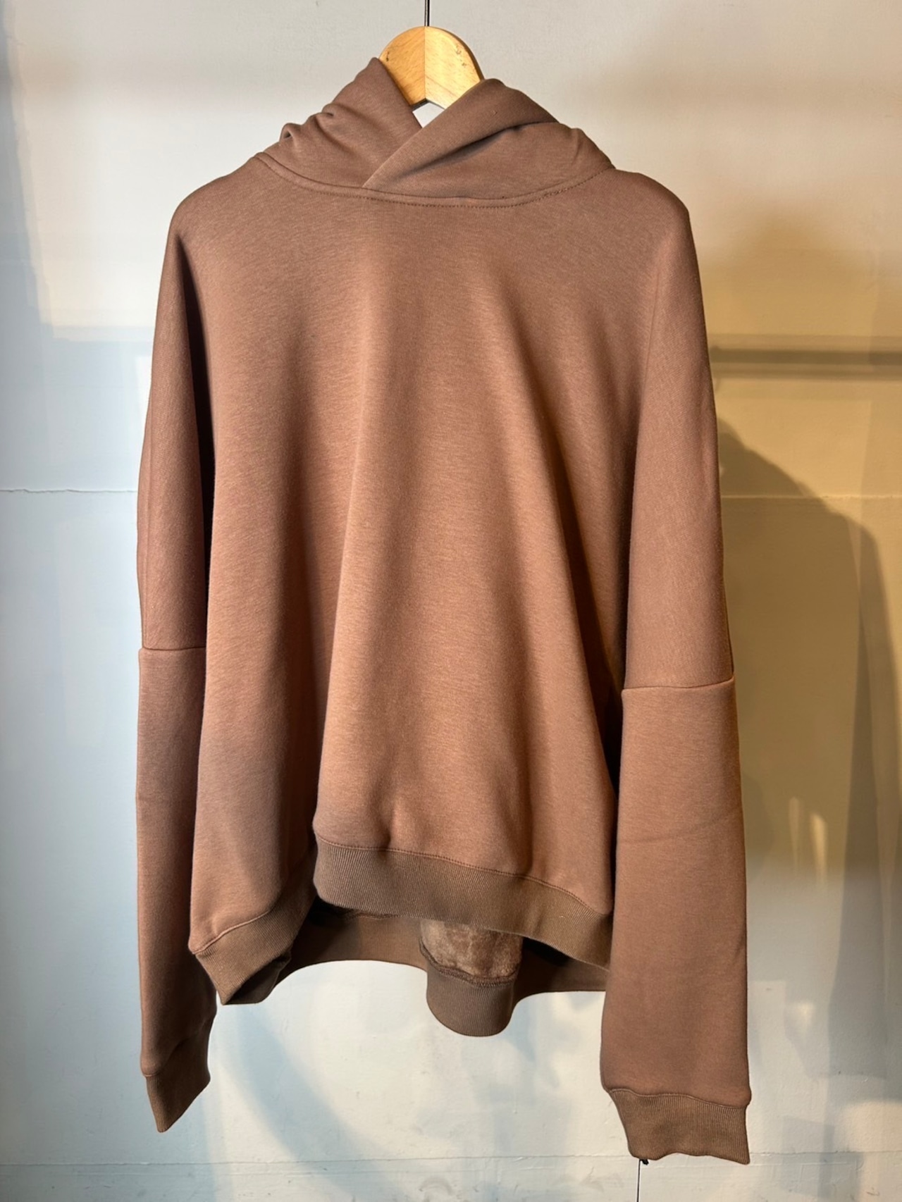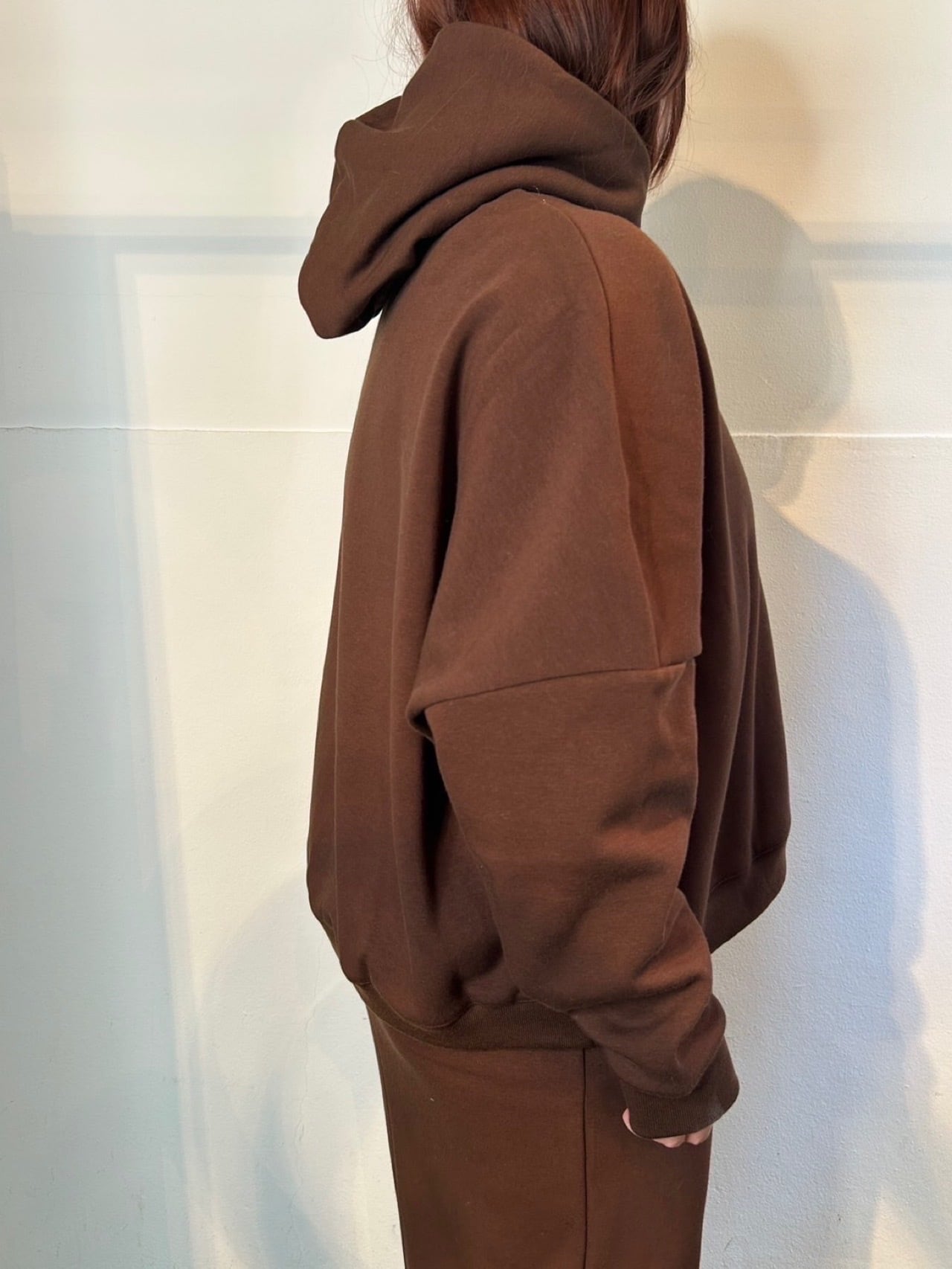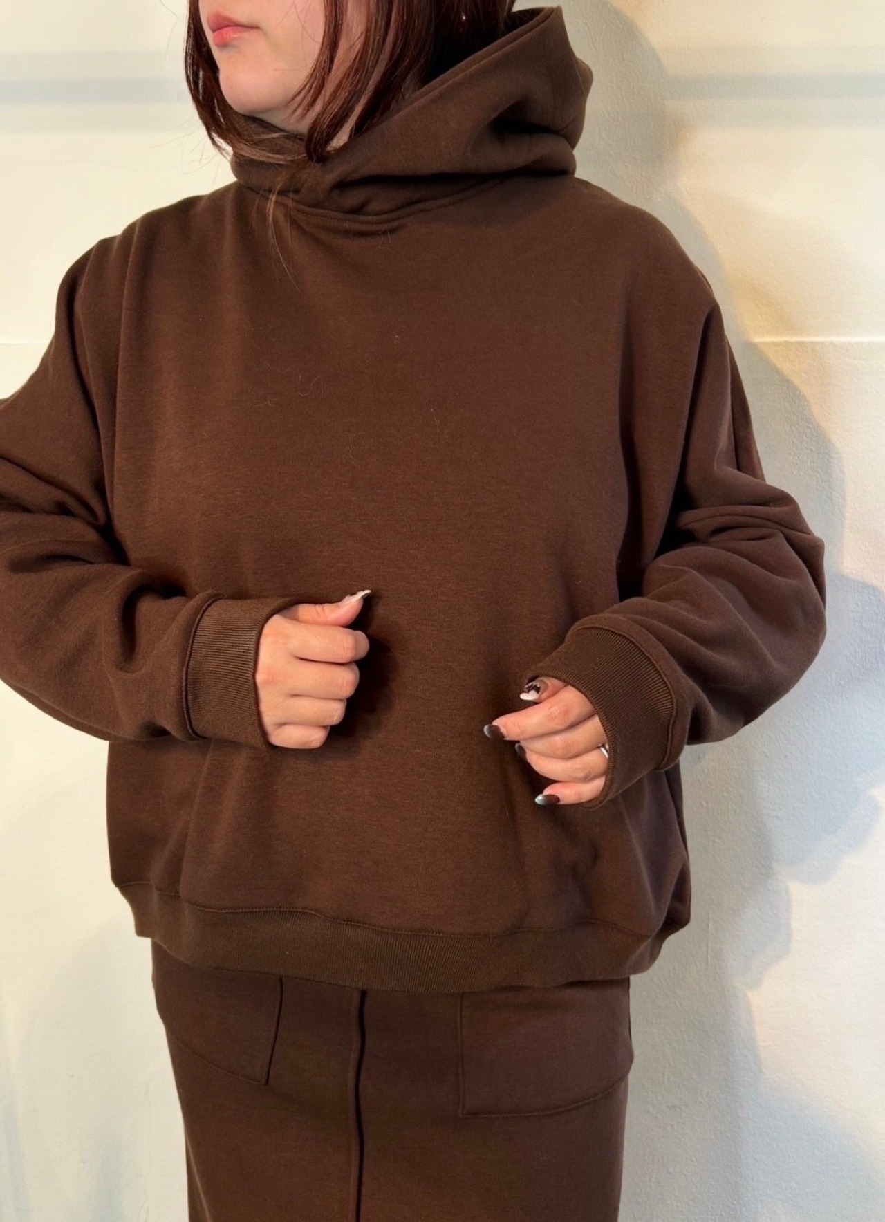 12月22日のインスタライブにてご紹介した裏起毛フーディスウェットプルオーバー。裏起毛で暖かい。コロンと丸いシルエットが女性らしいプルオーバーです。
