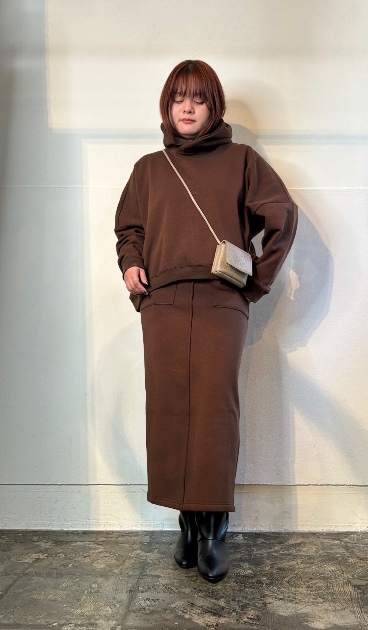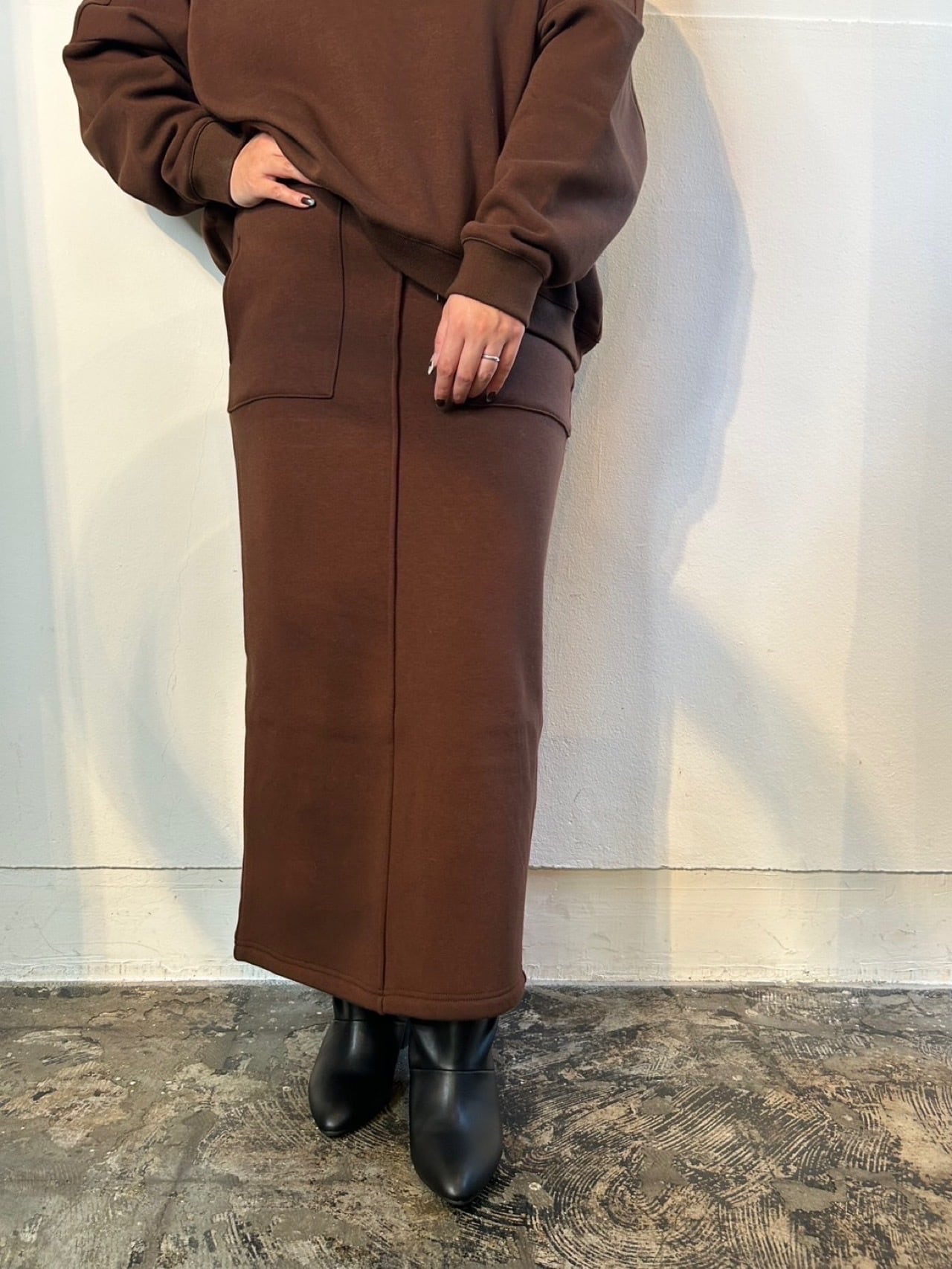 12月22日のインスタライブでご紹介した裏起毛タイトスカート。裏起毛生地を使用したIラインシルエットのスカートです。あたたかく履き心地もとてもよいスカートです。ウエストは総ゴムで紐で調節可能。