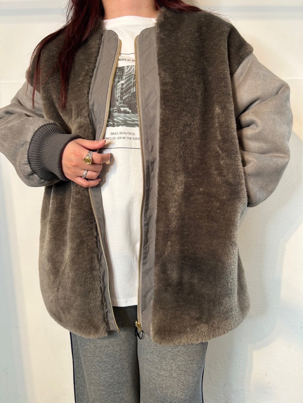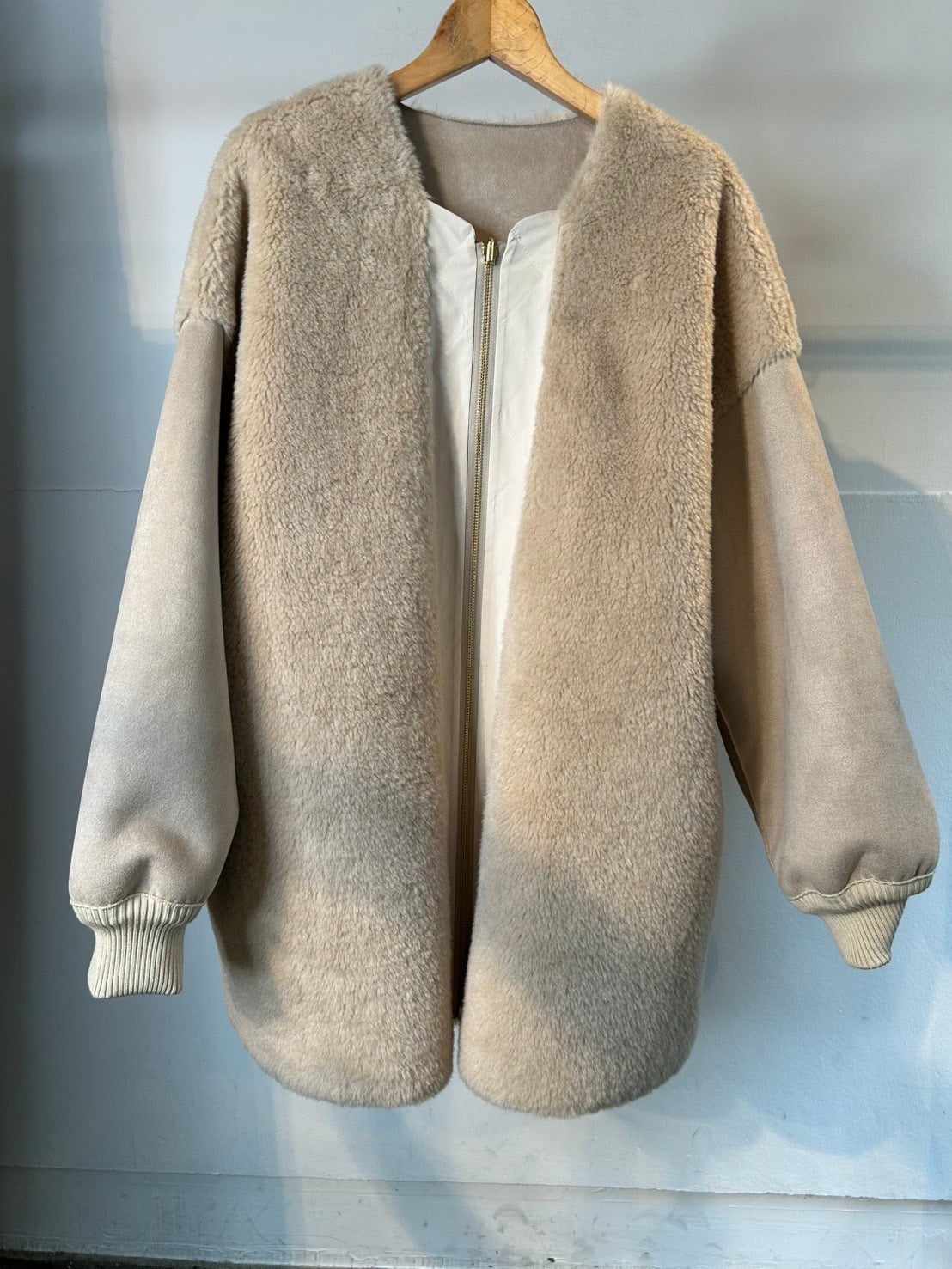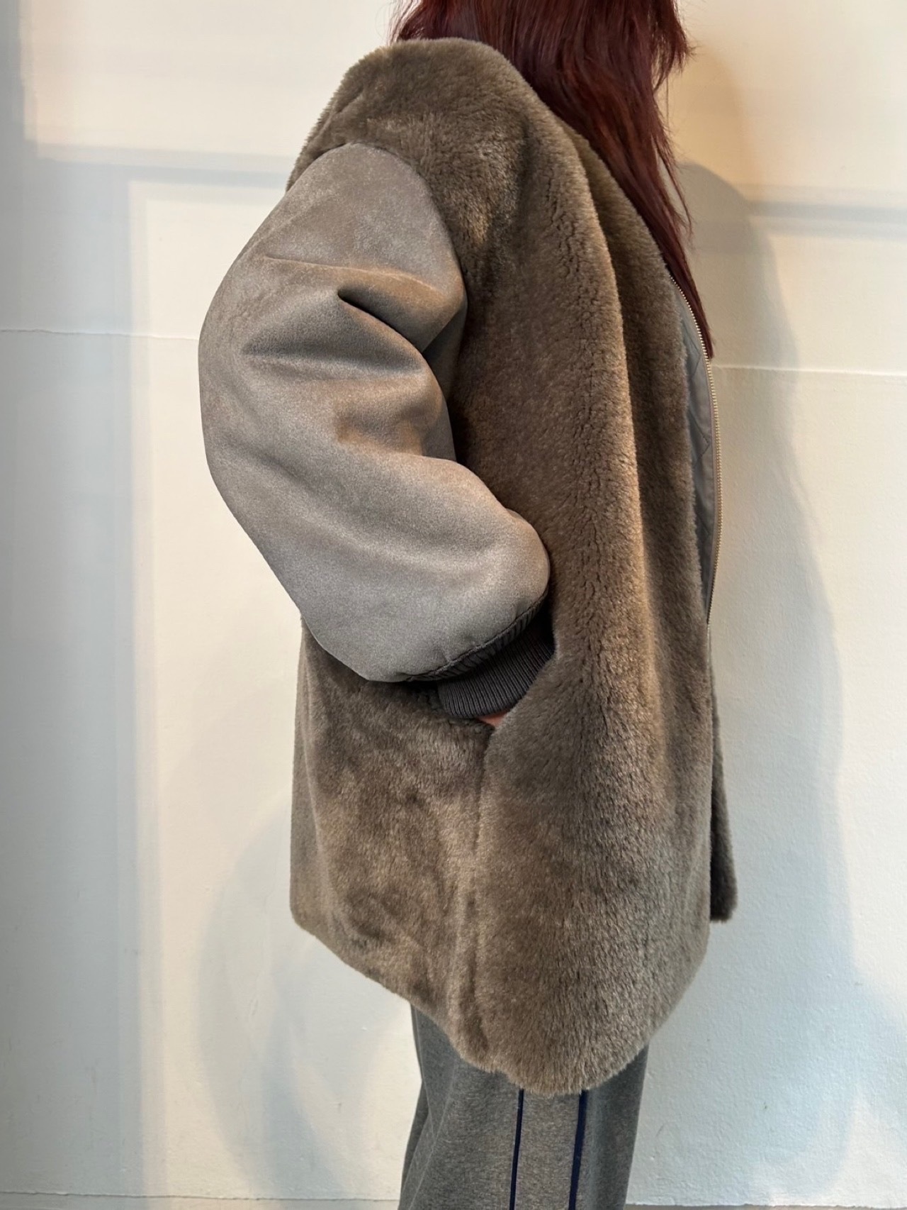 12月29日のインスタライブでご紹介したフェイクムートン2WAYコート。フェイクムートンと、エコファーの異素材ドッキングコート。リバーシブルなので雰囲気を変えて楽しめます。袖口はリブ仕様でカジュアルさをプラスし、防寒もバッチリ◎