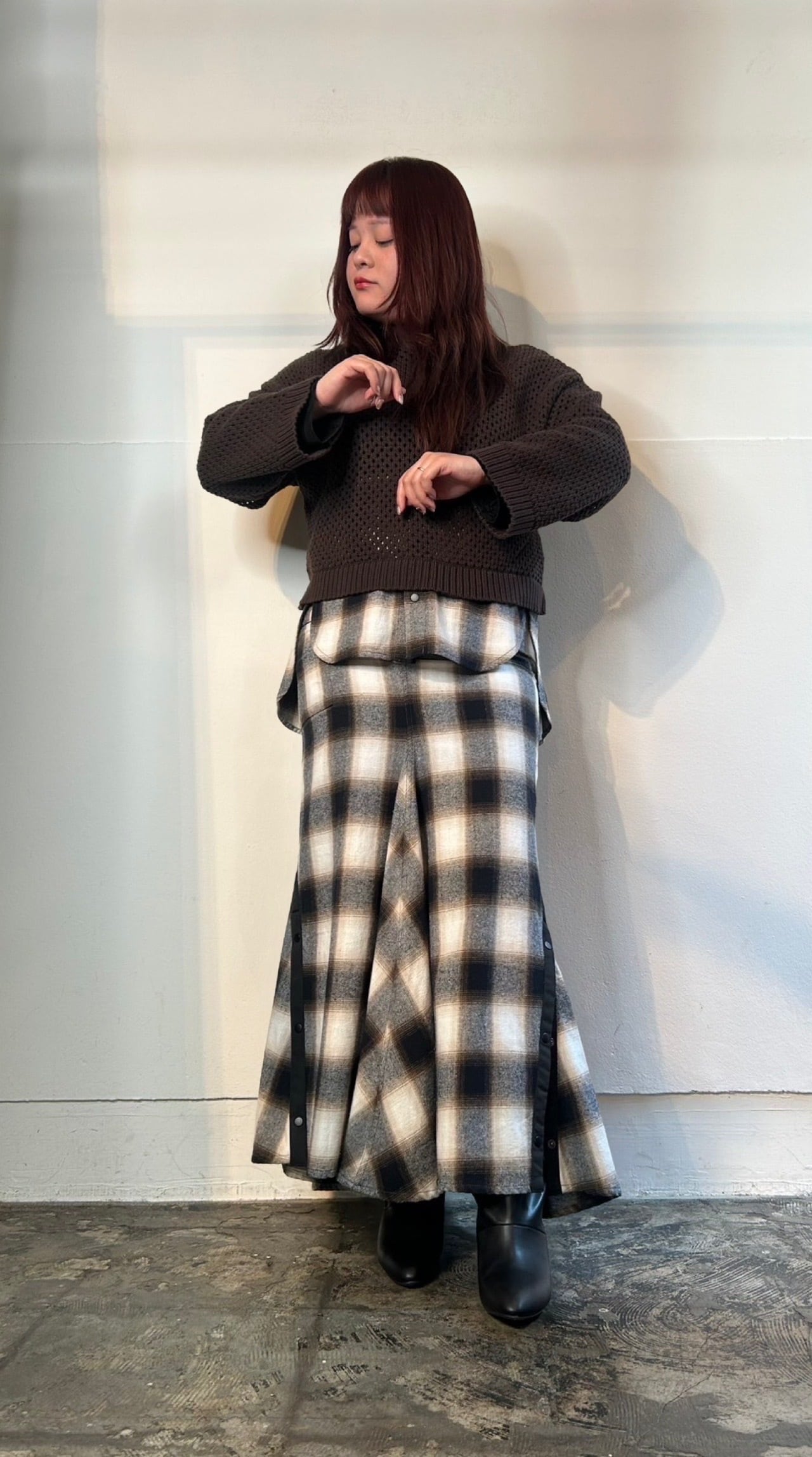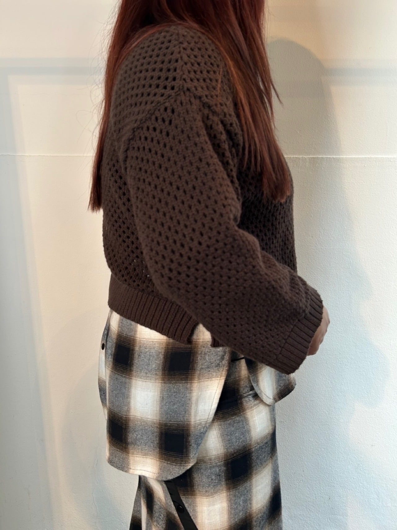編みニットはショート丈でお持ちのワンピースやカットソーとのレイヤードも可能◎チェック柄スカートとセットアップでの着用もおススメです。
