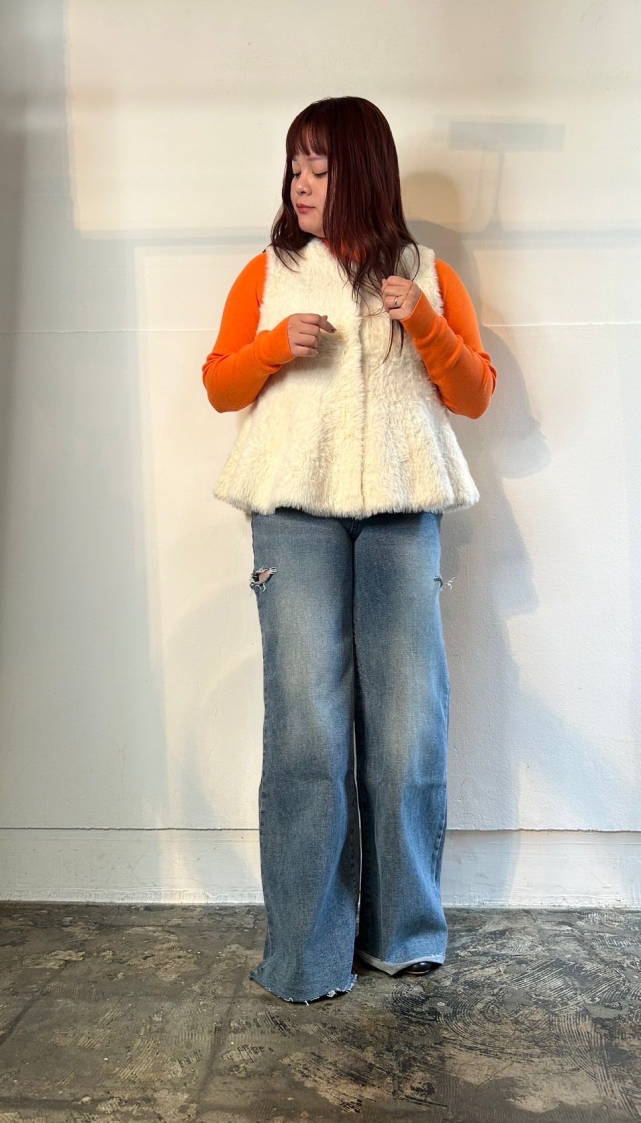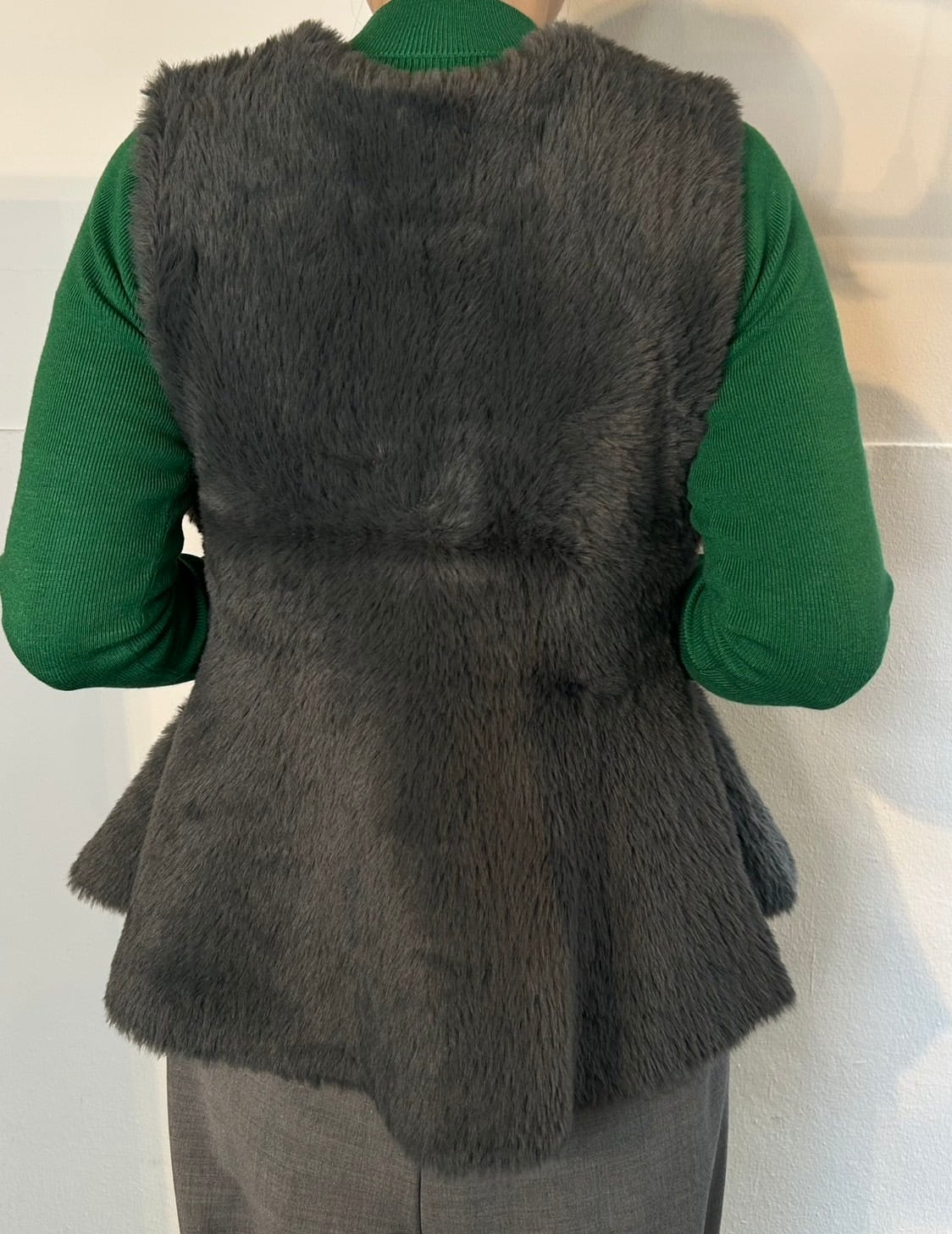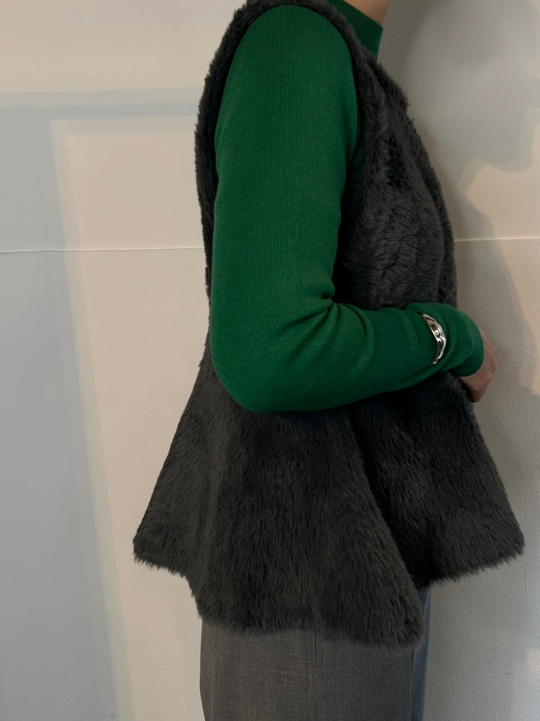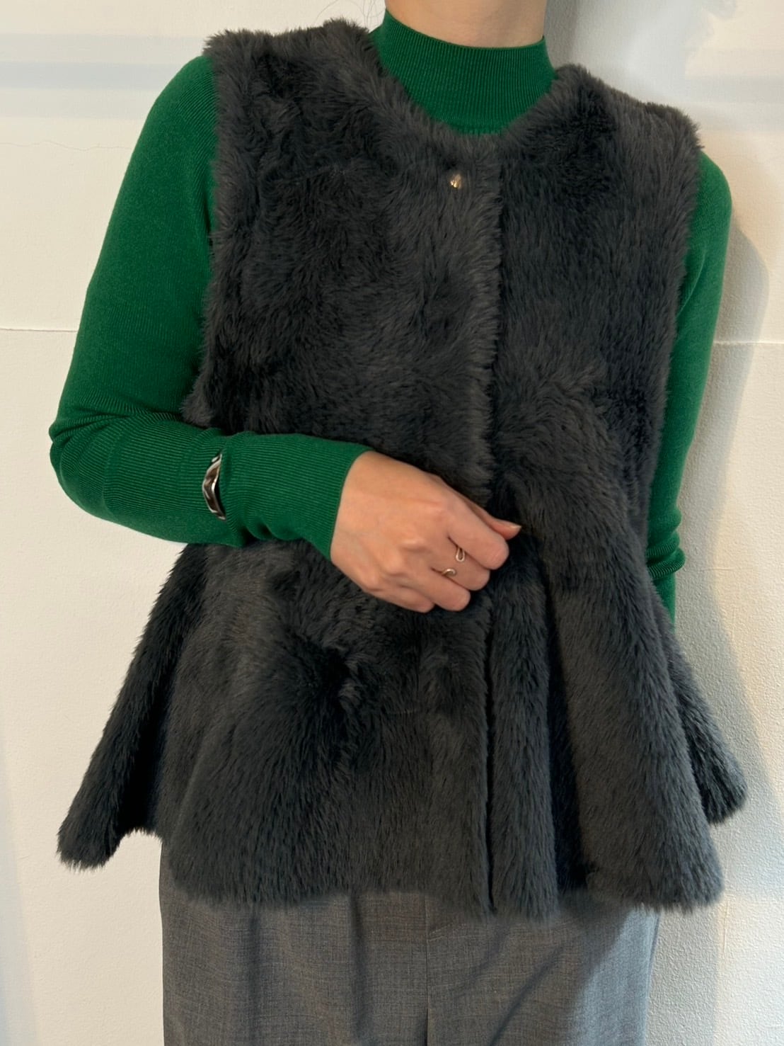 1月13日のインスタライブでご紹介したフェザーヤーンペプラムジレ。柔らかなフェザーヤーンを使用した、大人の可愛らしさを引き立てるジレ。ふんわりとした毛足が上品なぬくもりを感じさせ、ウエスト下に広がるペプラムデザインが女性らしいシルエットを演出。