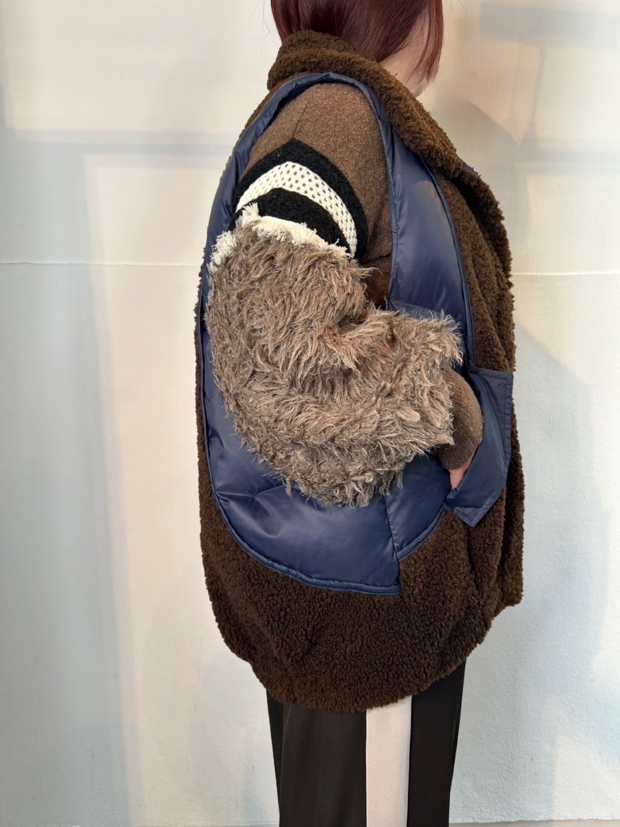 1月13日のインスタライブでご紹介したボア×タフタドッキングパデッドボリュームベスト。おしりをすっぽり隠せる長めの着丈は前後差を付けてすっきり見せ◎裾にタックを入れて丸みを出したシルエットです。