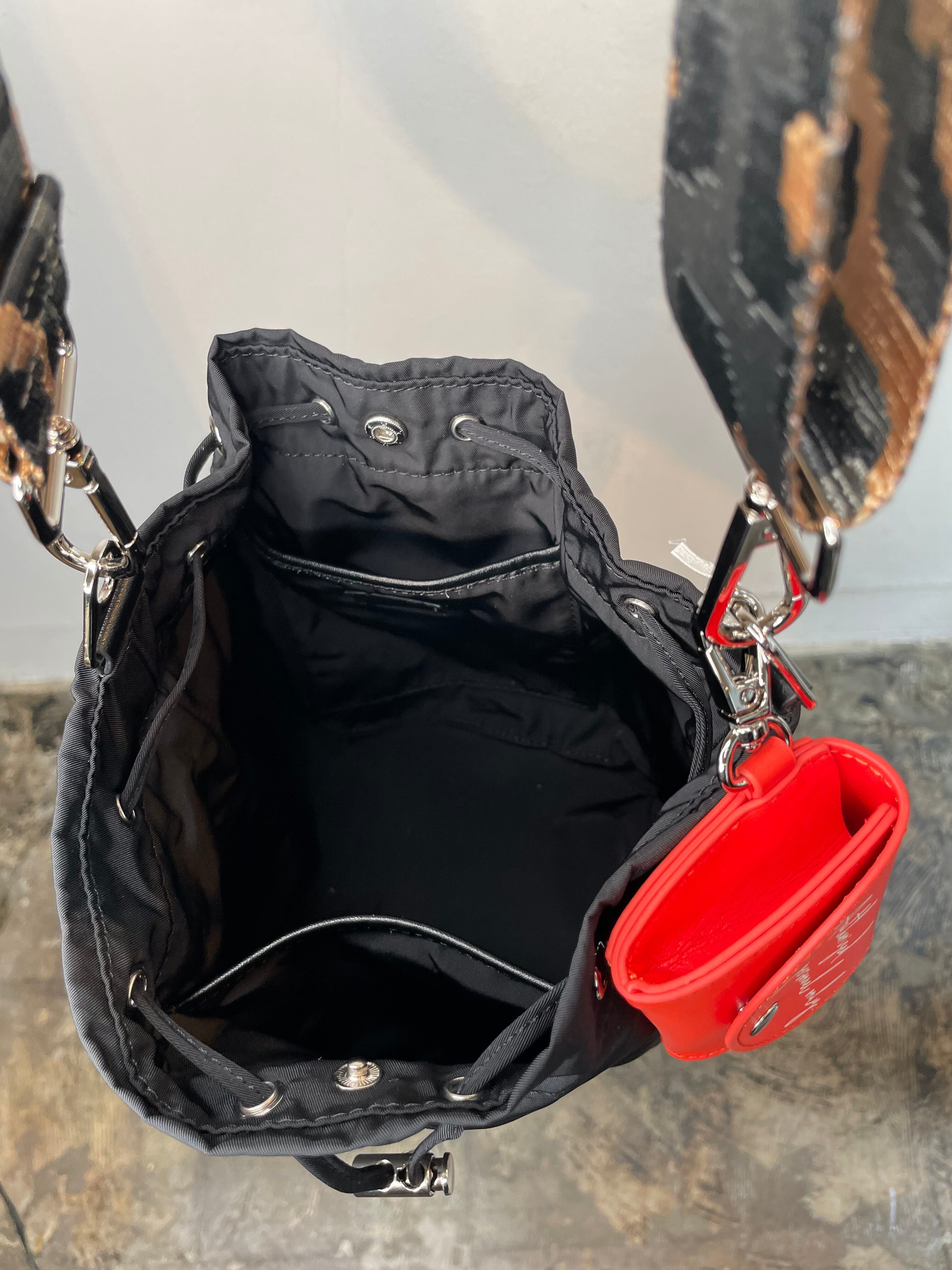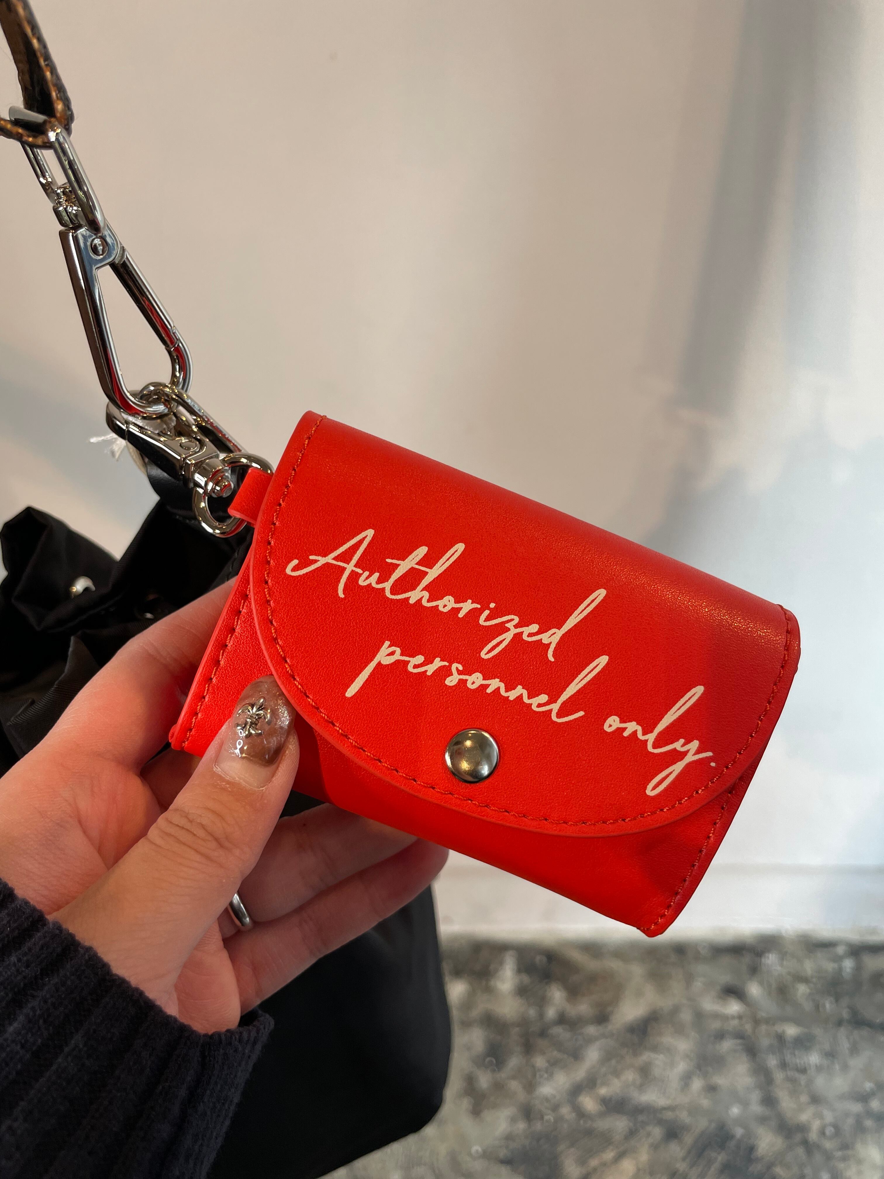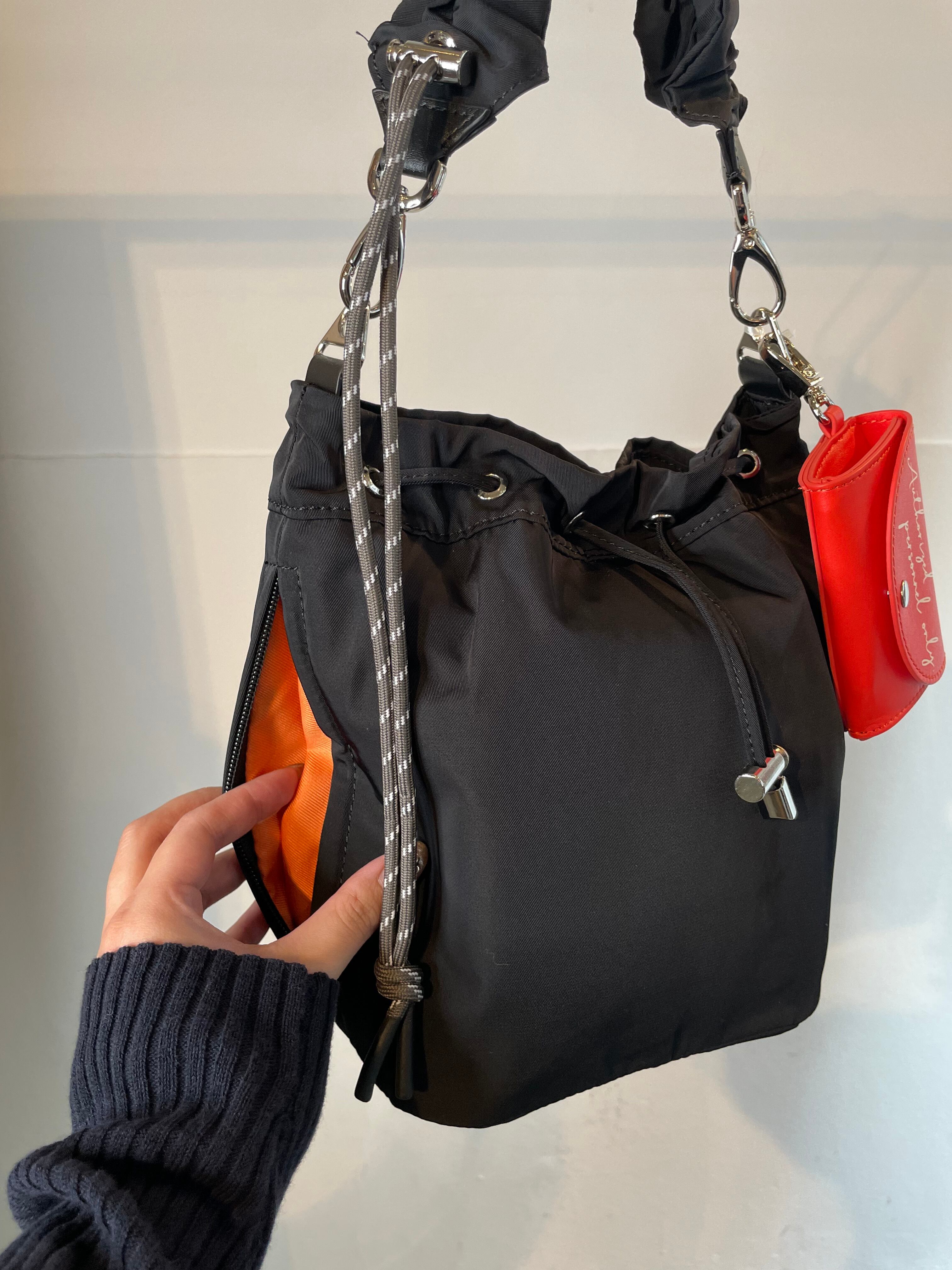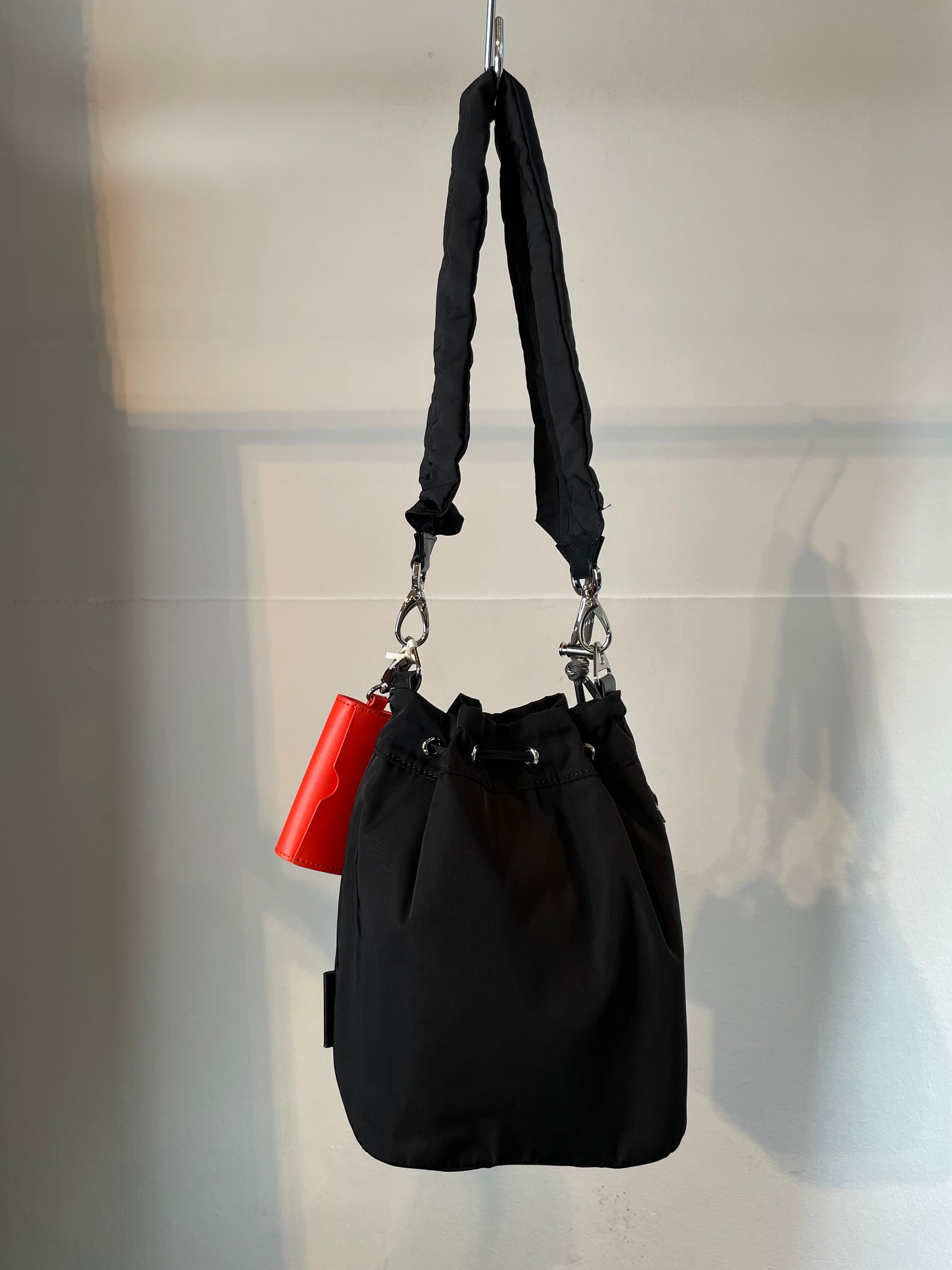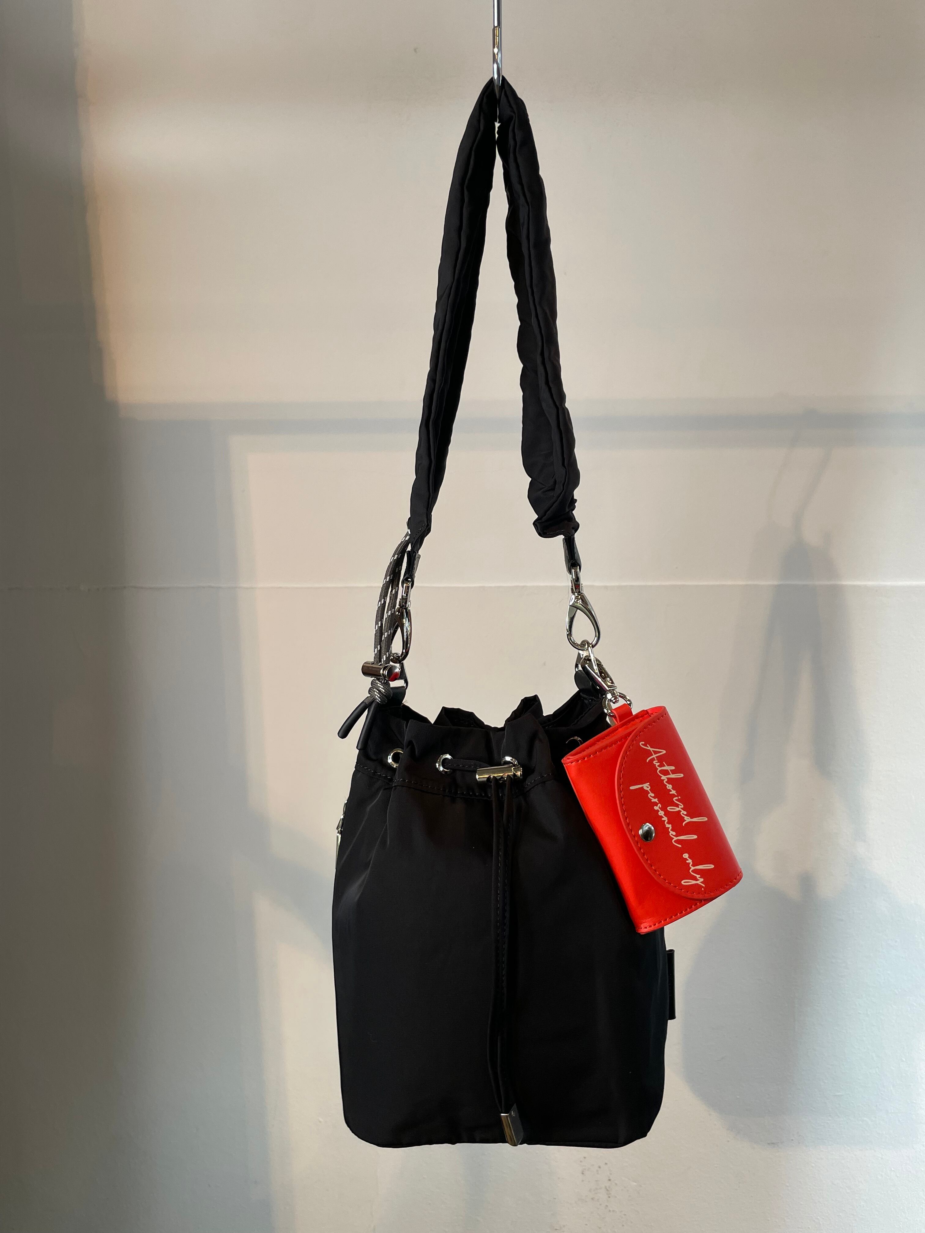 撥水加工。シャーリングショートストラップ、ショルダーストラップ、ポーチチャームが付属。