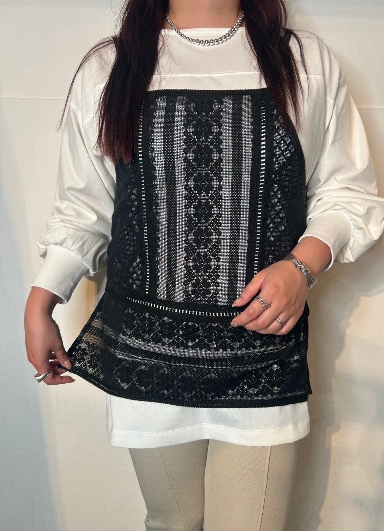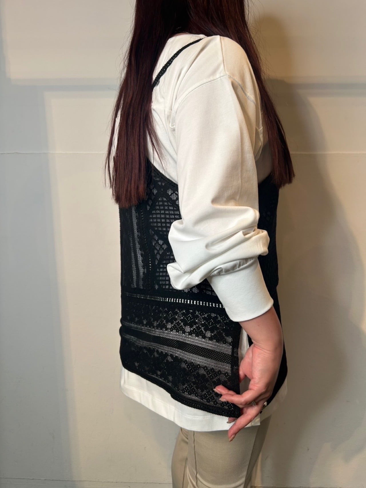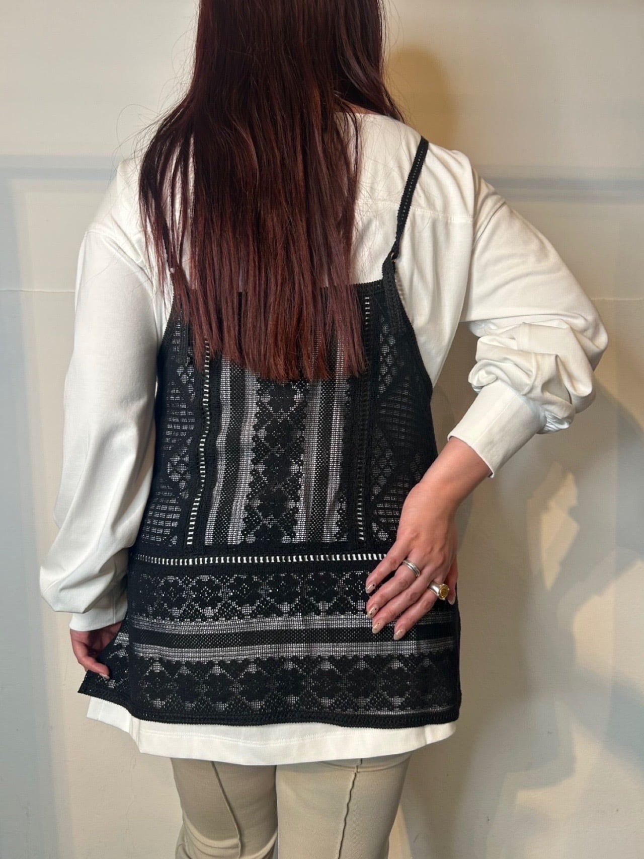 2月10日のインスタライブでご紹介したパッチワークレースキャミソール。表情の異なる2種類のレースとテープレースを贅沢に組み合わせた、パッチワークデザインのキャミソールです。今季のトレンドであるデニムやヴィンテージスタイルに欠かせないレースアイテムを、綿混のナチュラルカジュアルな素材感で表現。