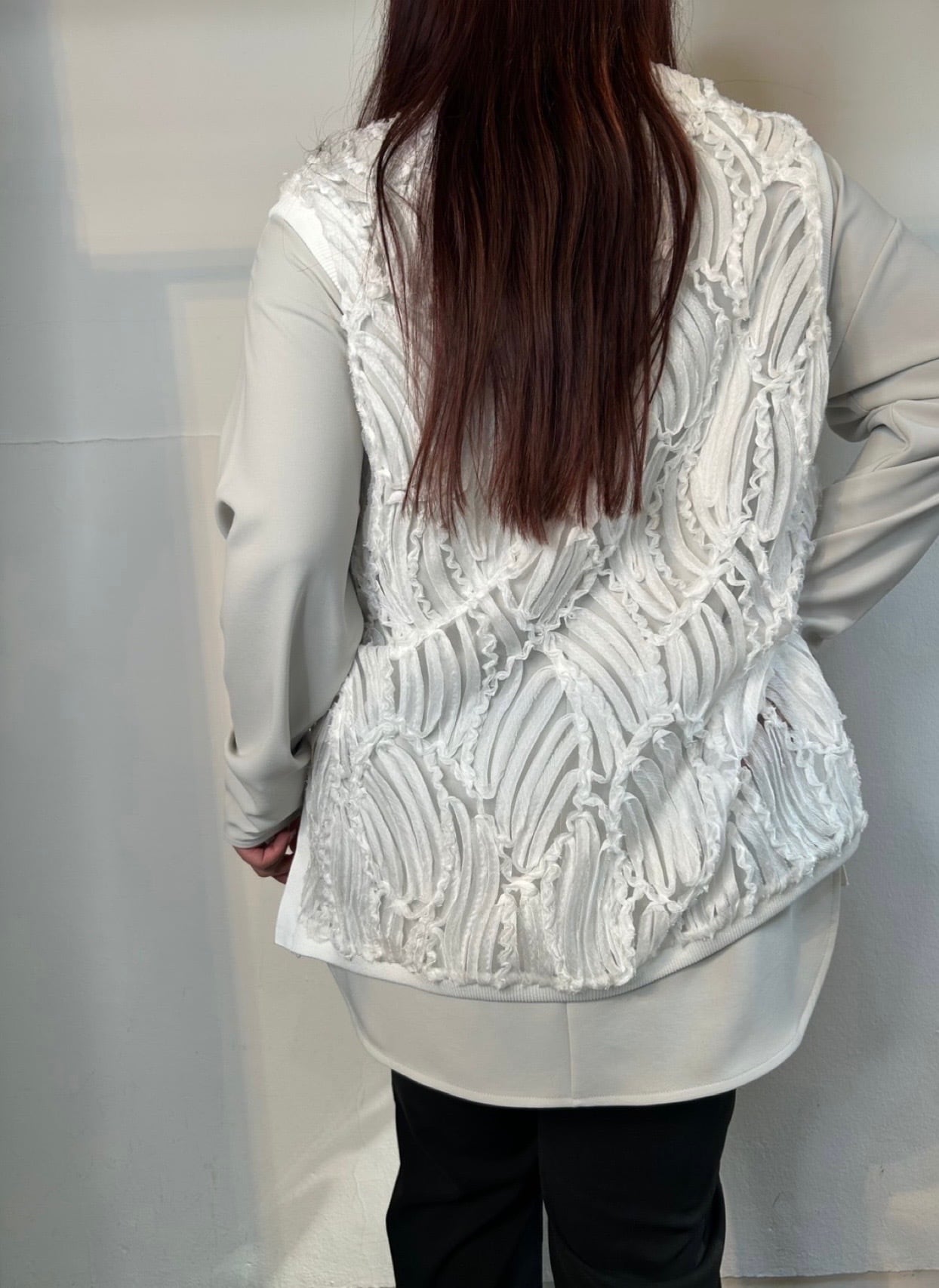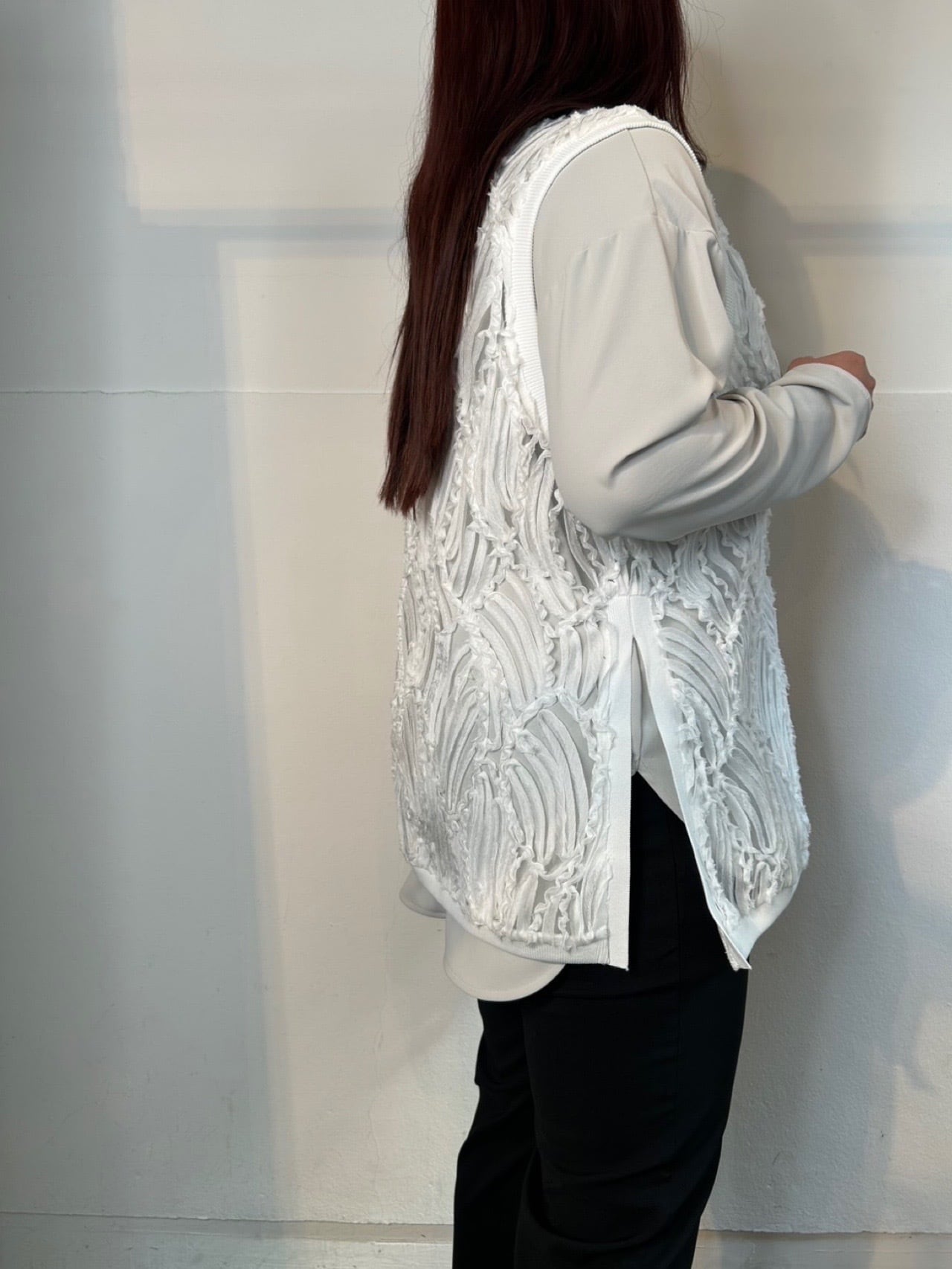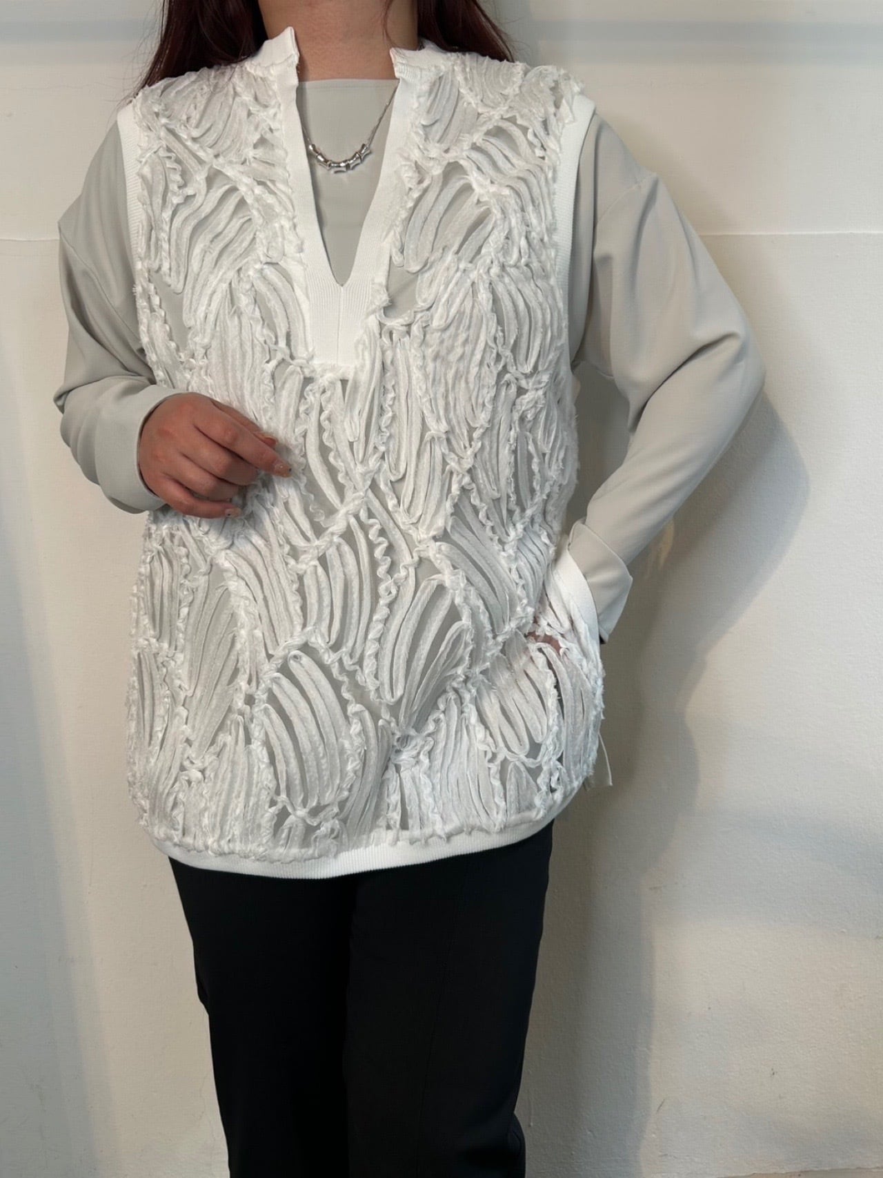 2月20日のインスタライブでご紹介したスキッパーレースチュニックジレ。深めのVあきが