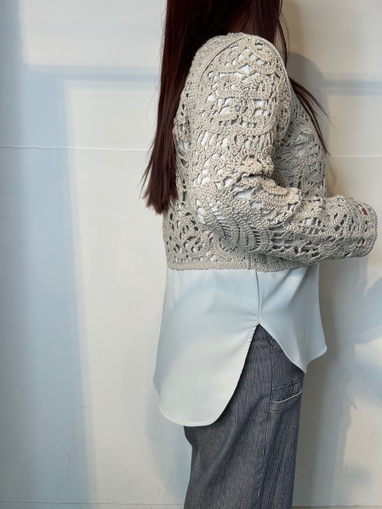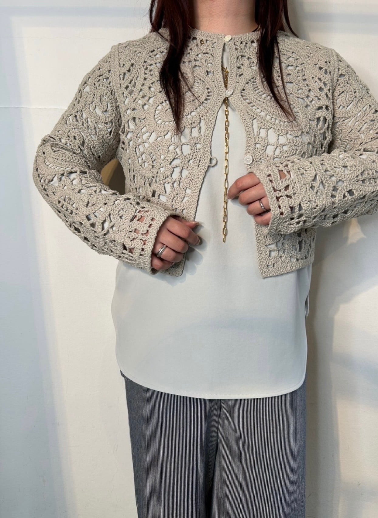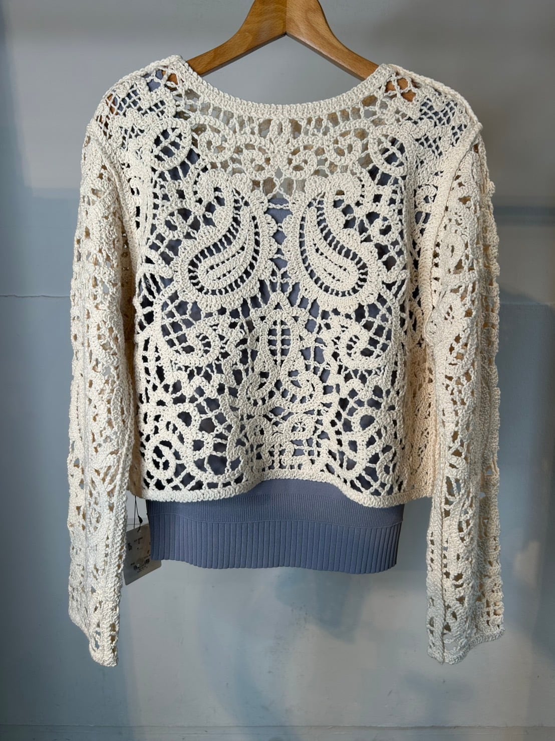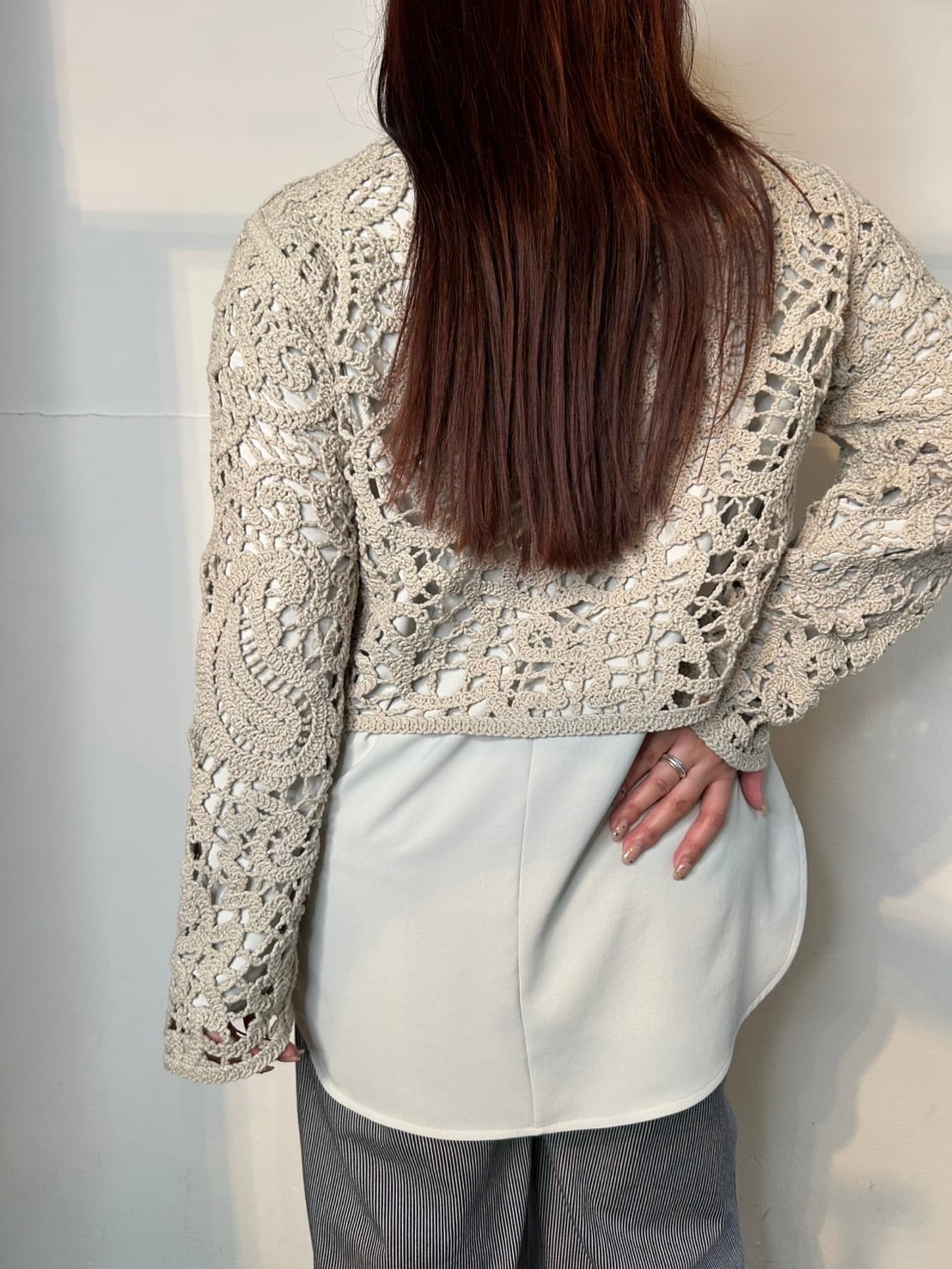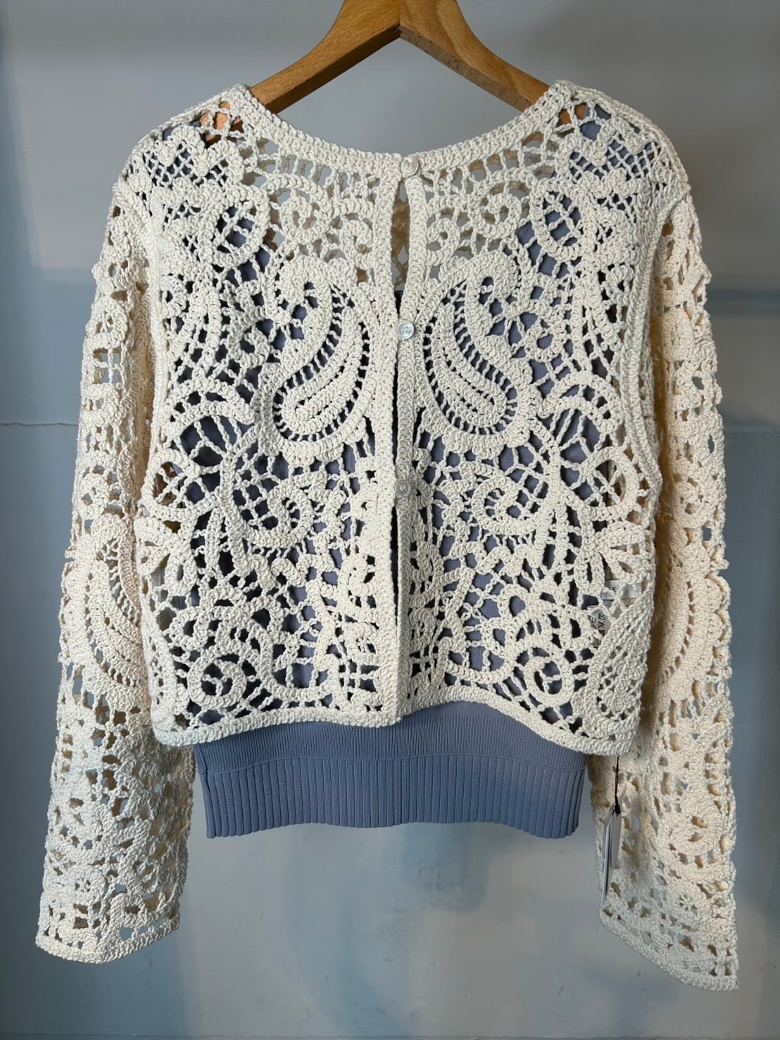 2月25日のインスタライブでご紹介したペイズリー柄ニットカーディガン。リリヤーンの糸をペイズリー柄にレース刺繍した、長袖カーディガン。フロントは貝ボタンあきの仕様で、前後着用可能です。