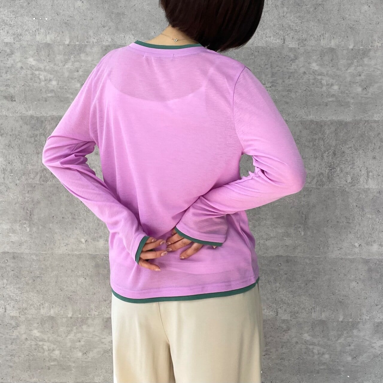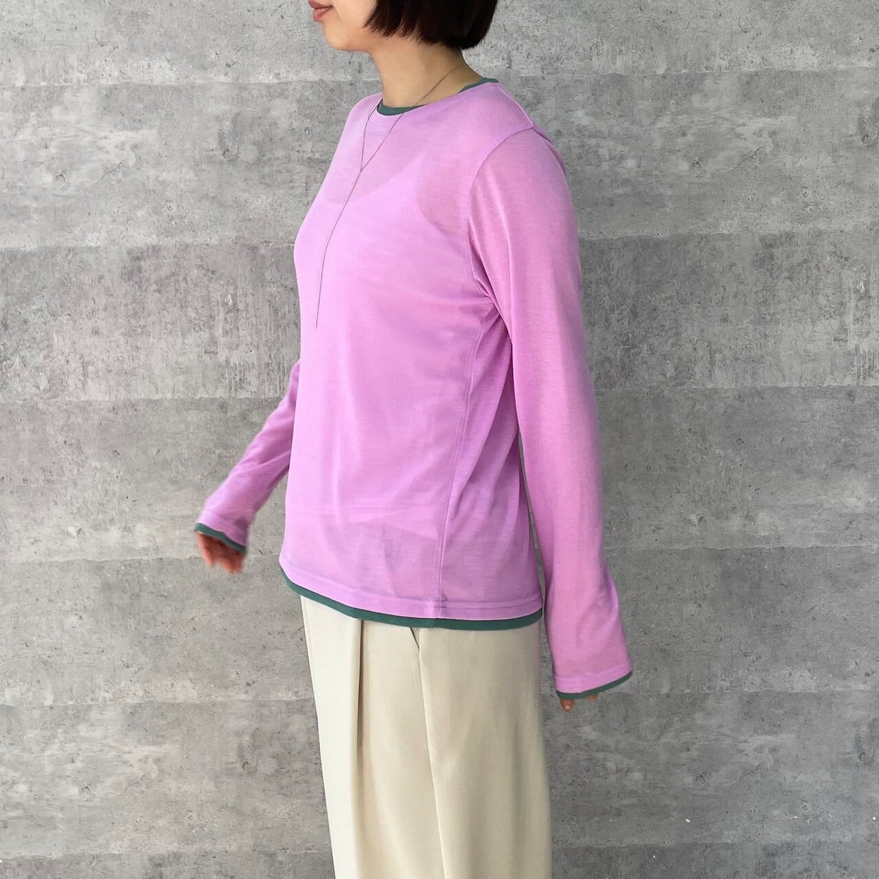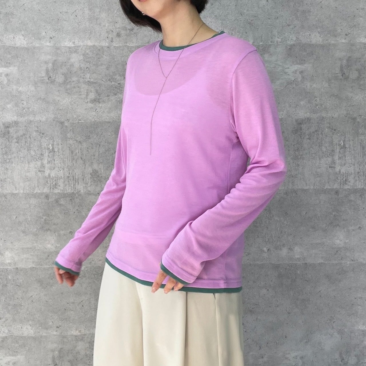 3月10日のインスタライブでご紹介したカラーブロックシアーロンT。透け感のあるリブ地素材がトレンド感あるロンT。レイヤードしているようなディティールと遊び心ある配色がシンプルなインナーとは一味違うスタイリングのポイントになる1着です。