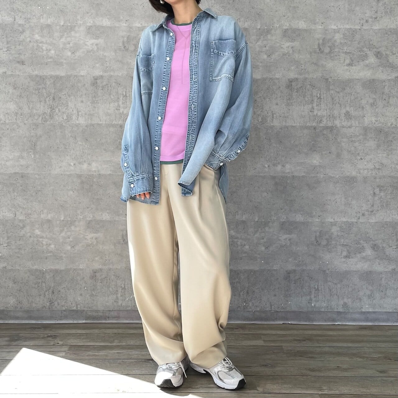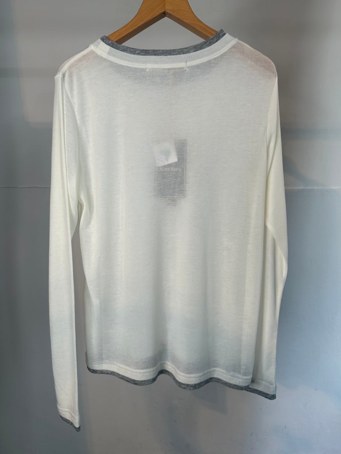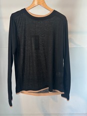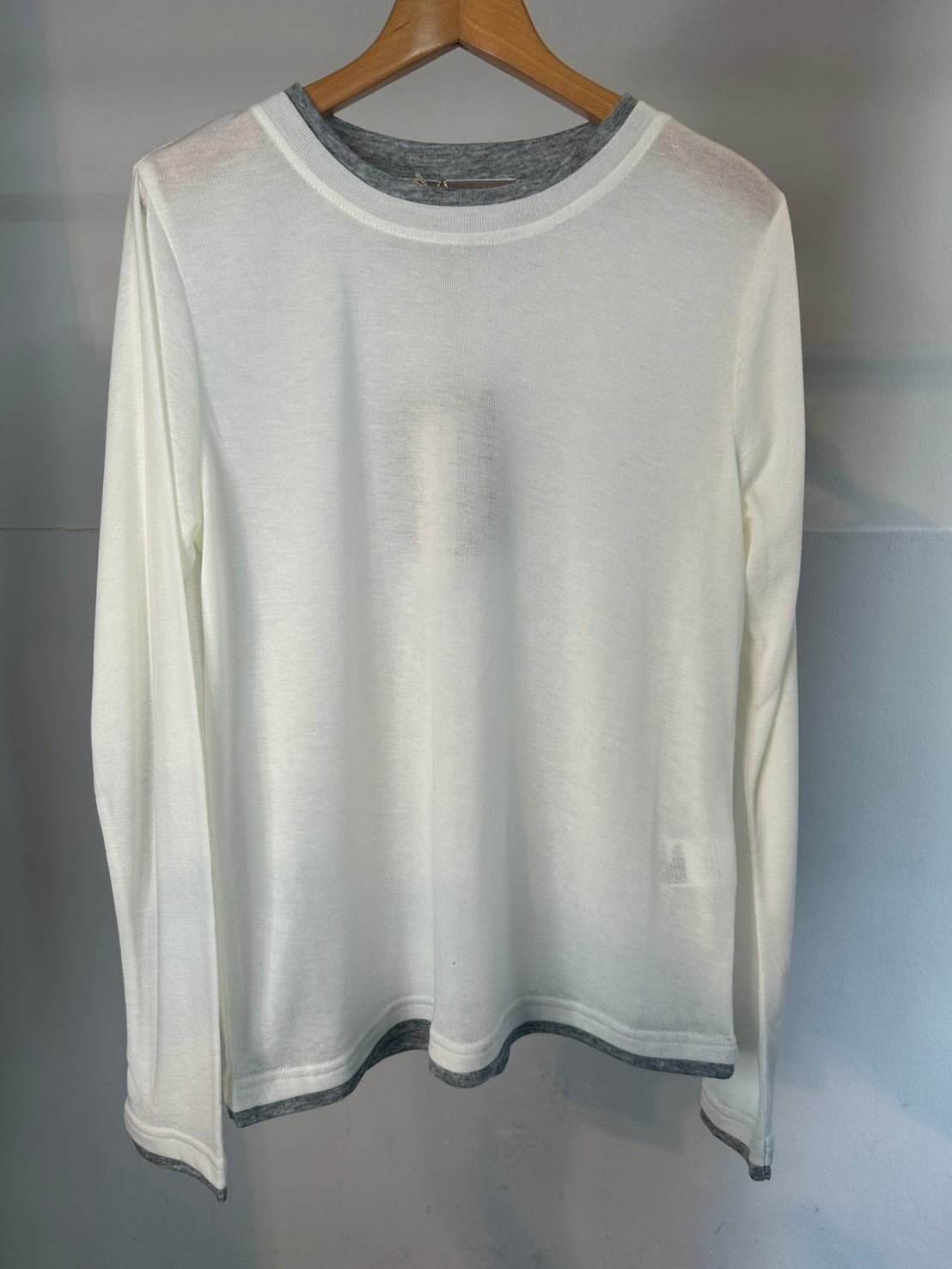 3月10日のインスタライブでご紹介したカラーブロックシアーロンT。透け感のあるリブ地素材がトレンド感あるロンT。レイヤードしているようなディティールと遊び心ある配色がシンプルなインナーとは一味違うスタイリングのポイントになる1着です。