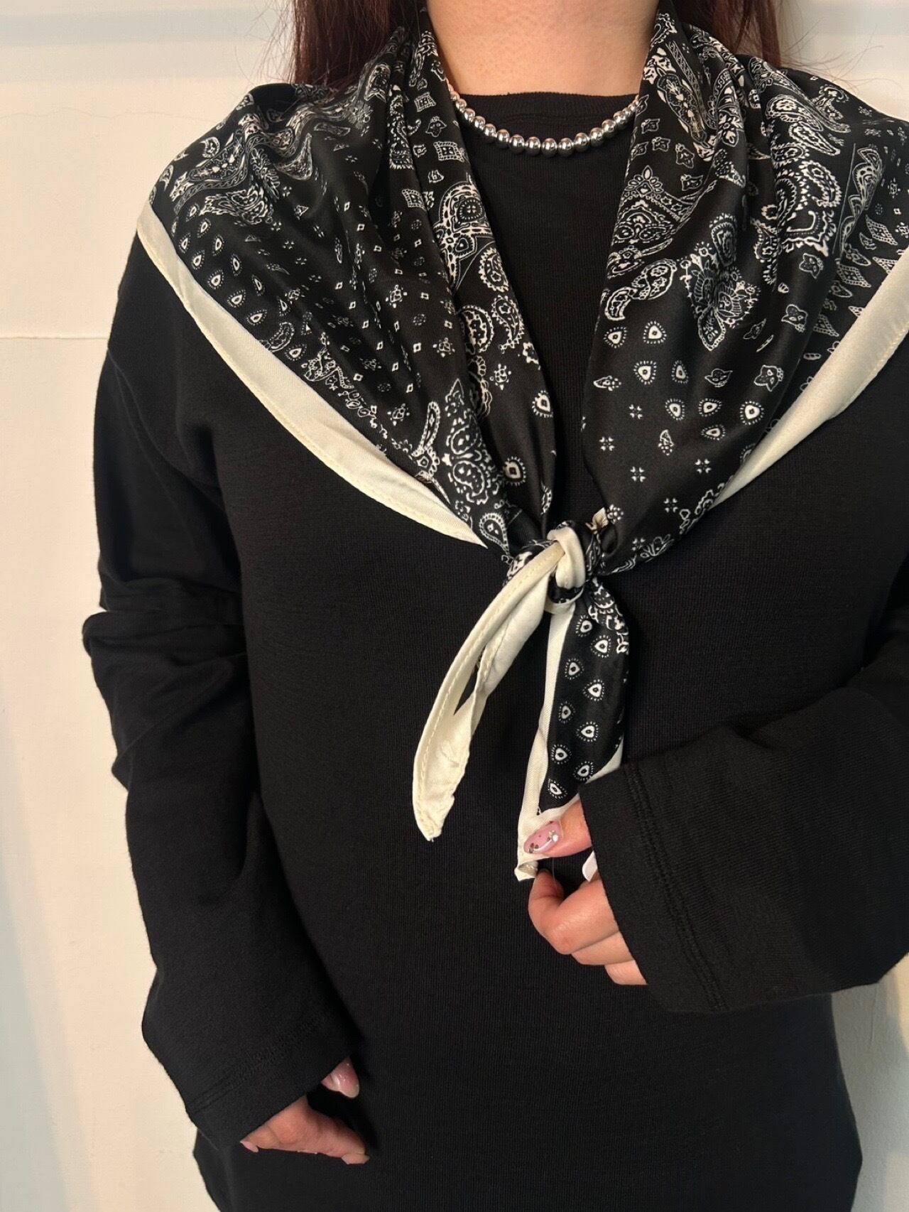 3月18日のインスタライブにてご紹介したペイズリースカーフ。首元にさっと巻いたり、腰回りに巻くだけで、一気に洗練された印象に。