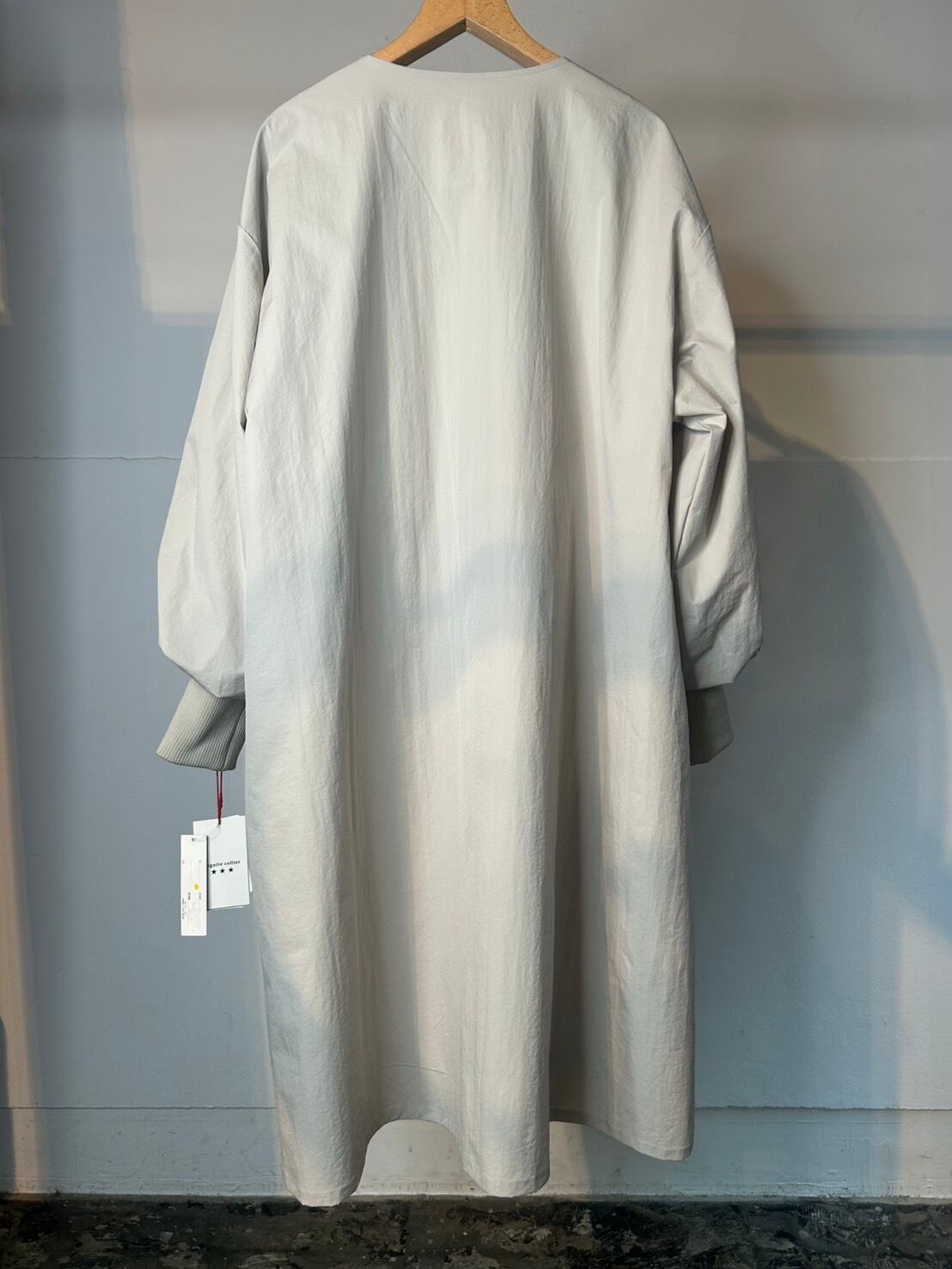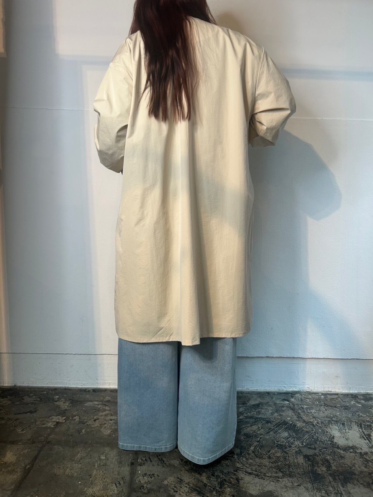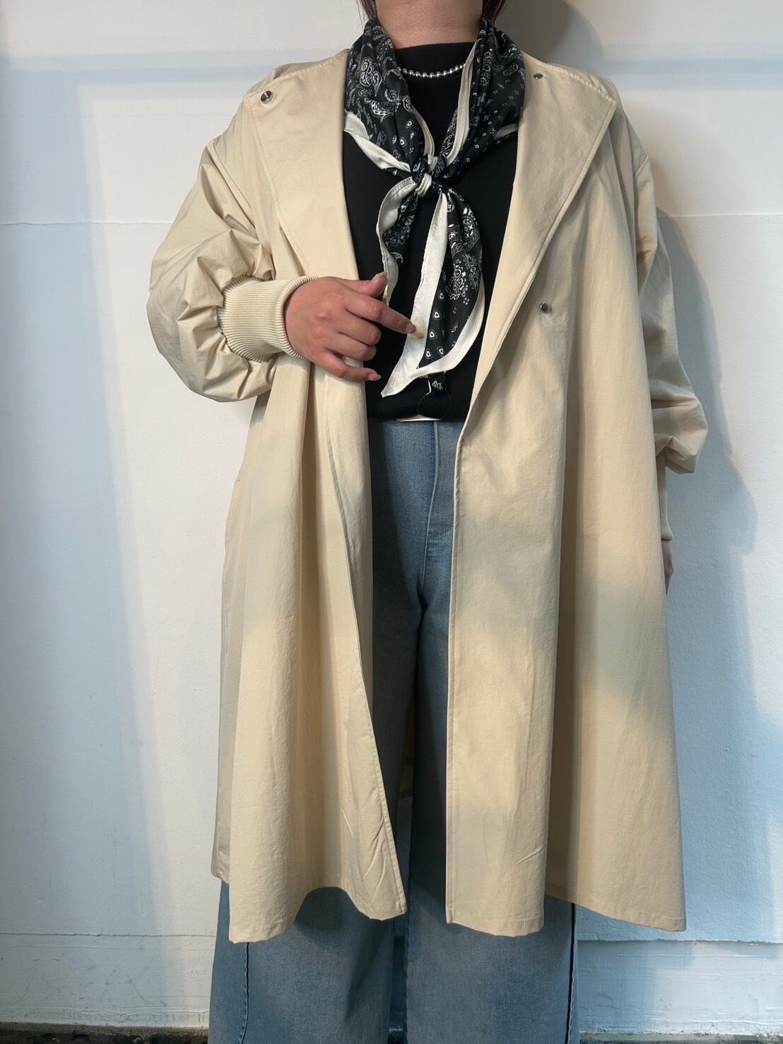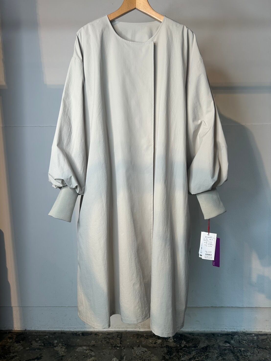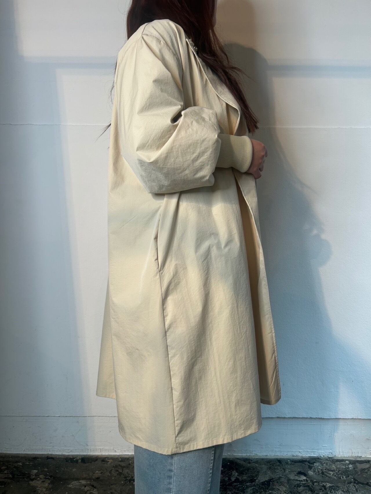 3月18日のインスタライブでご紹介した袖リブライトコート。軽くシャリ感があり微ワッシャー加工が施されたポリエステル生地を使用。ゆったりとした身幅のAラインシルエットに長めの袖リブを施し、袖をふんわりとさせて、フロントを比翼仕立てでスッキリ感をプラスし、女性らしい印象に。