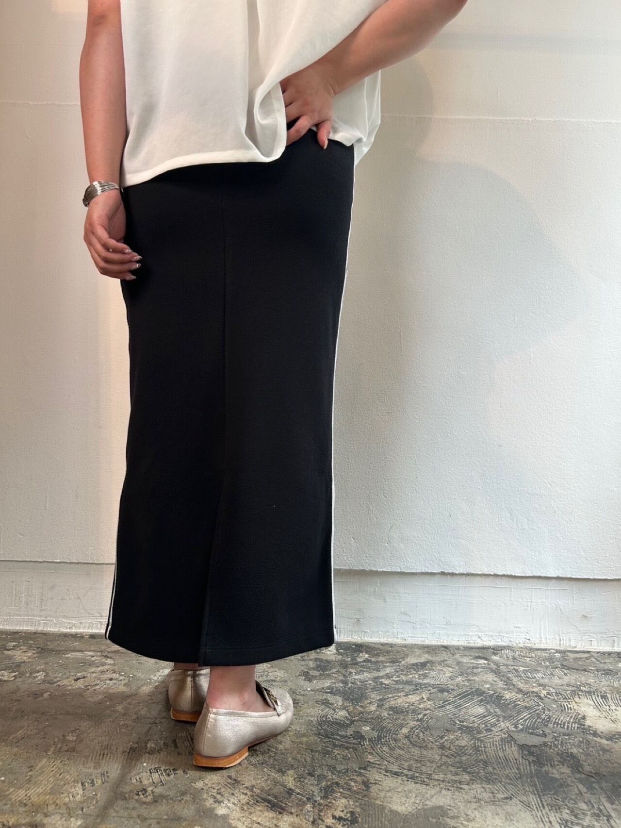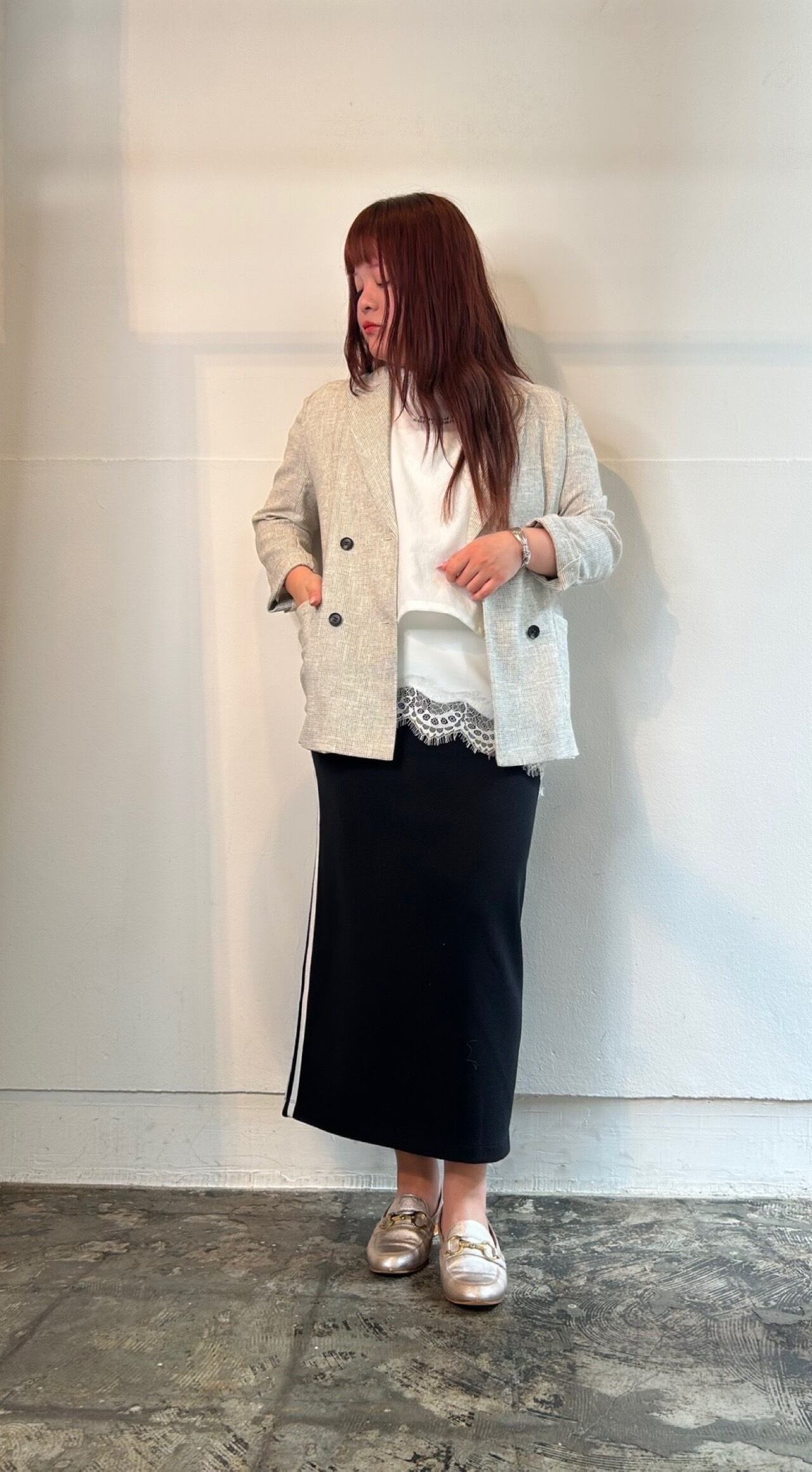 3月30日のインスタライブでご紹介したサイドラインタイトスカート。ザラっとした表面感にサイドラインがモードな印象のタイトスカート。