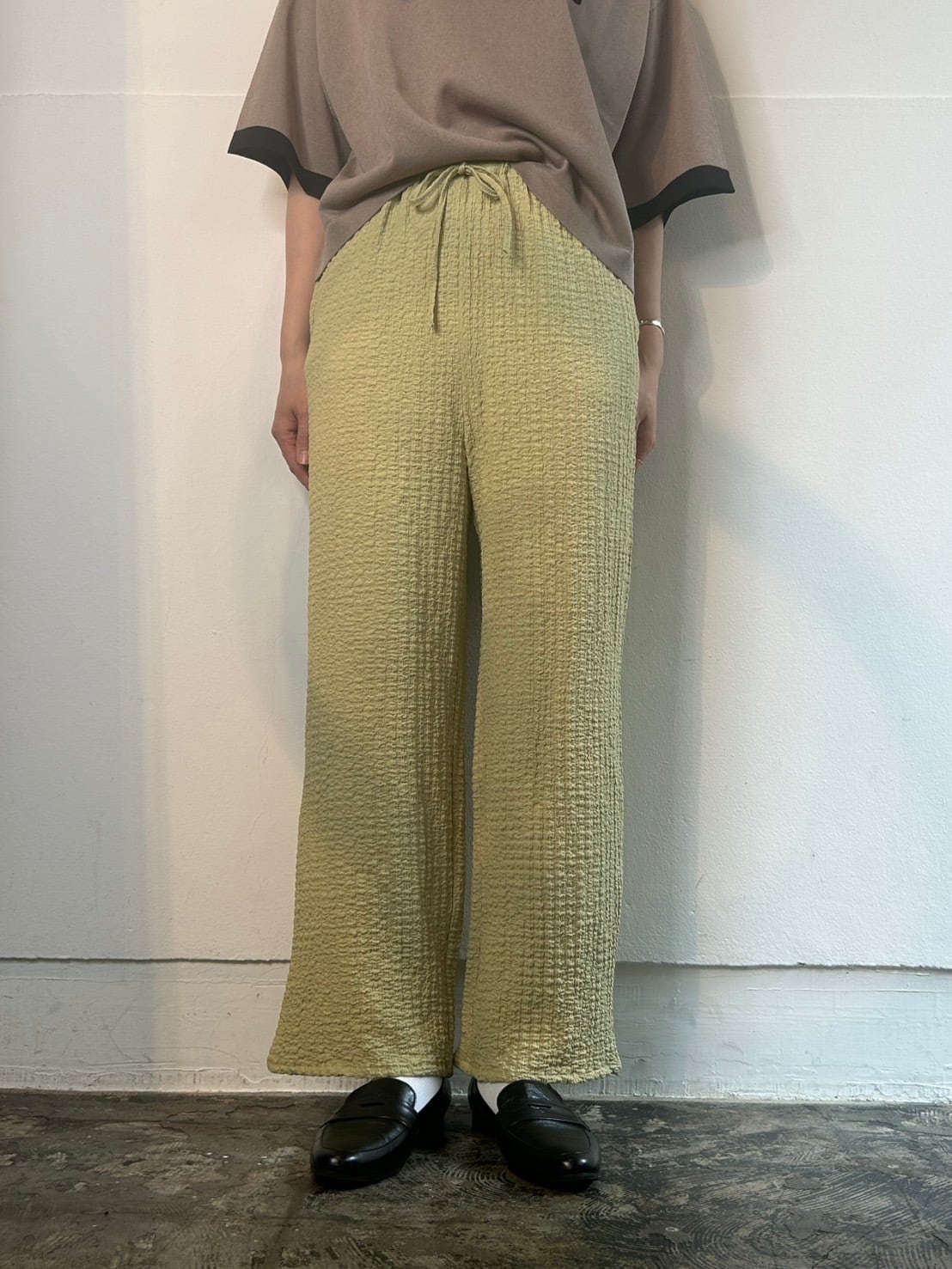 4月14日のインスタライブでご紹介した楊柳ワイドカットパンツ。涼しくて楽ちんなパンツです。ワイドすぎないシルエットが上品で楊柳のシボがポイント◎