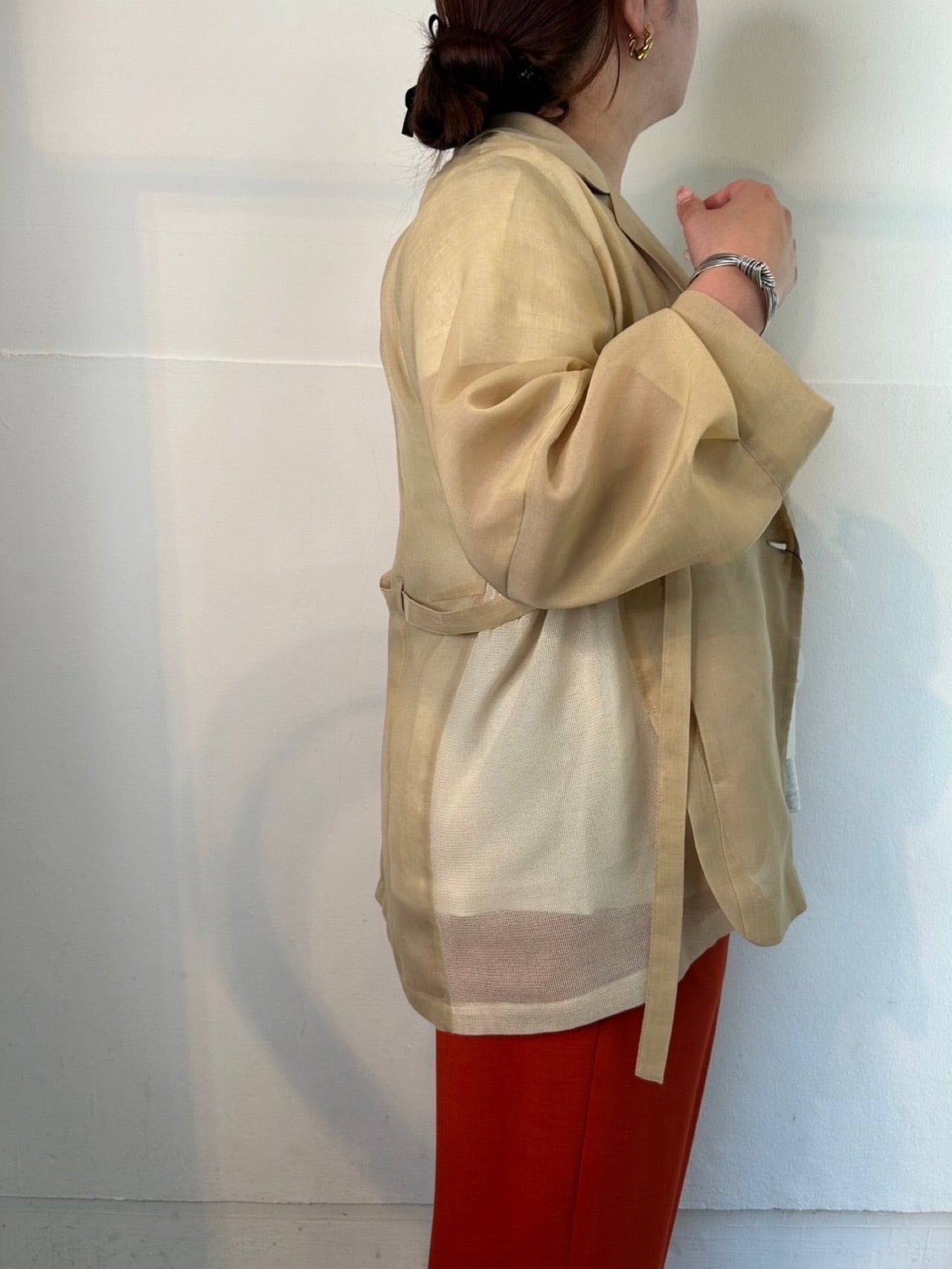 4月20日のインスタライブでご紹介したダブルフラップシアージャケット。一本の糸で太さにムラがあるカチオンワルツ糸を100%使用したオーガンジー素材で、表情に深みがあり、柔らかくハリのある素材感が魅力です。