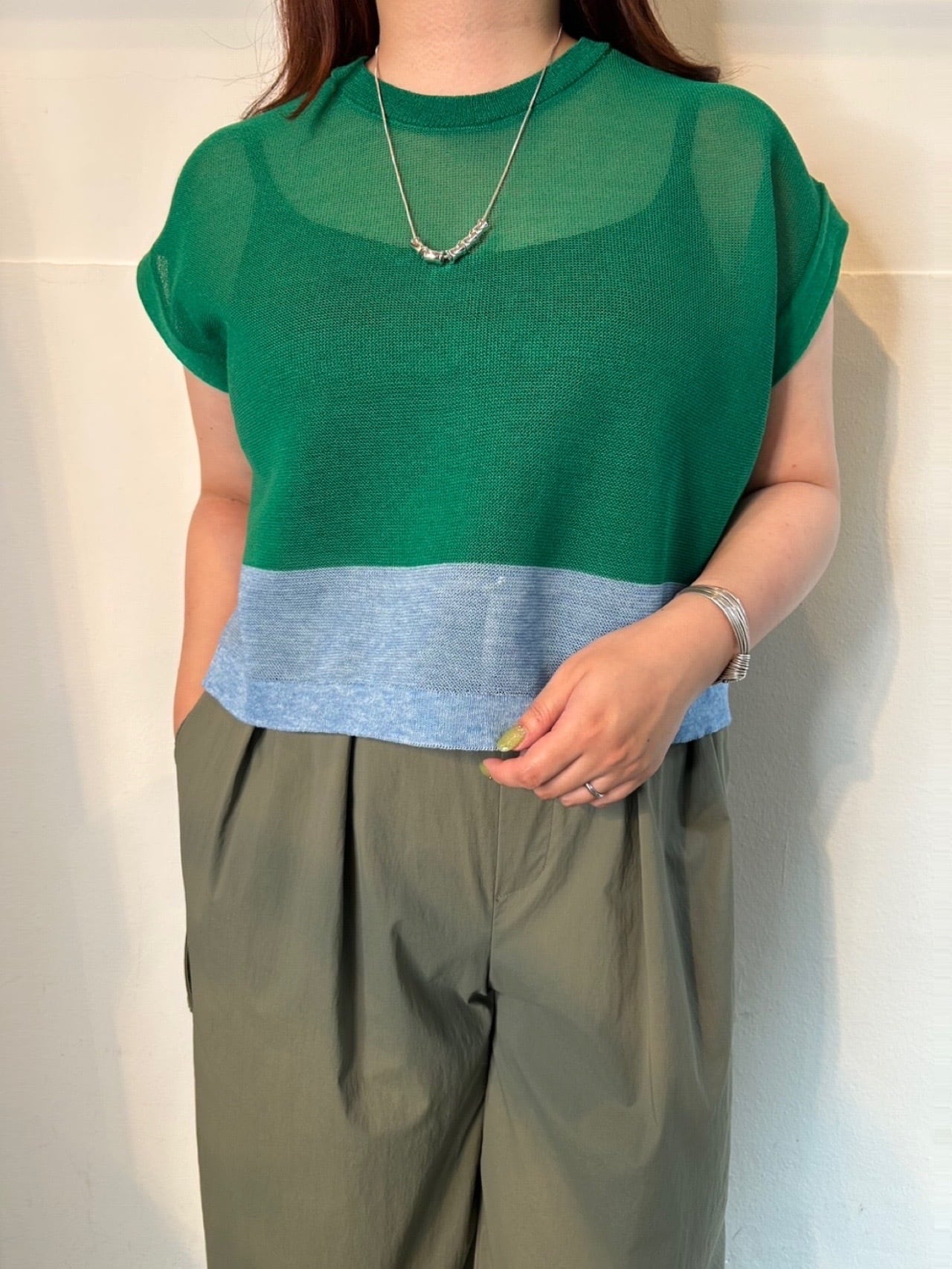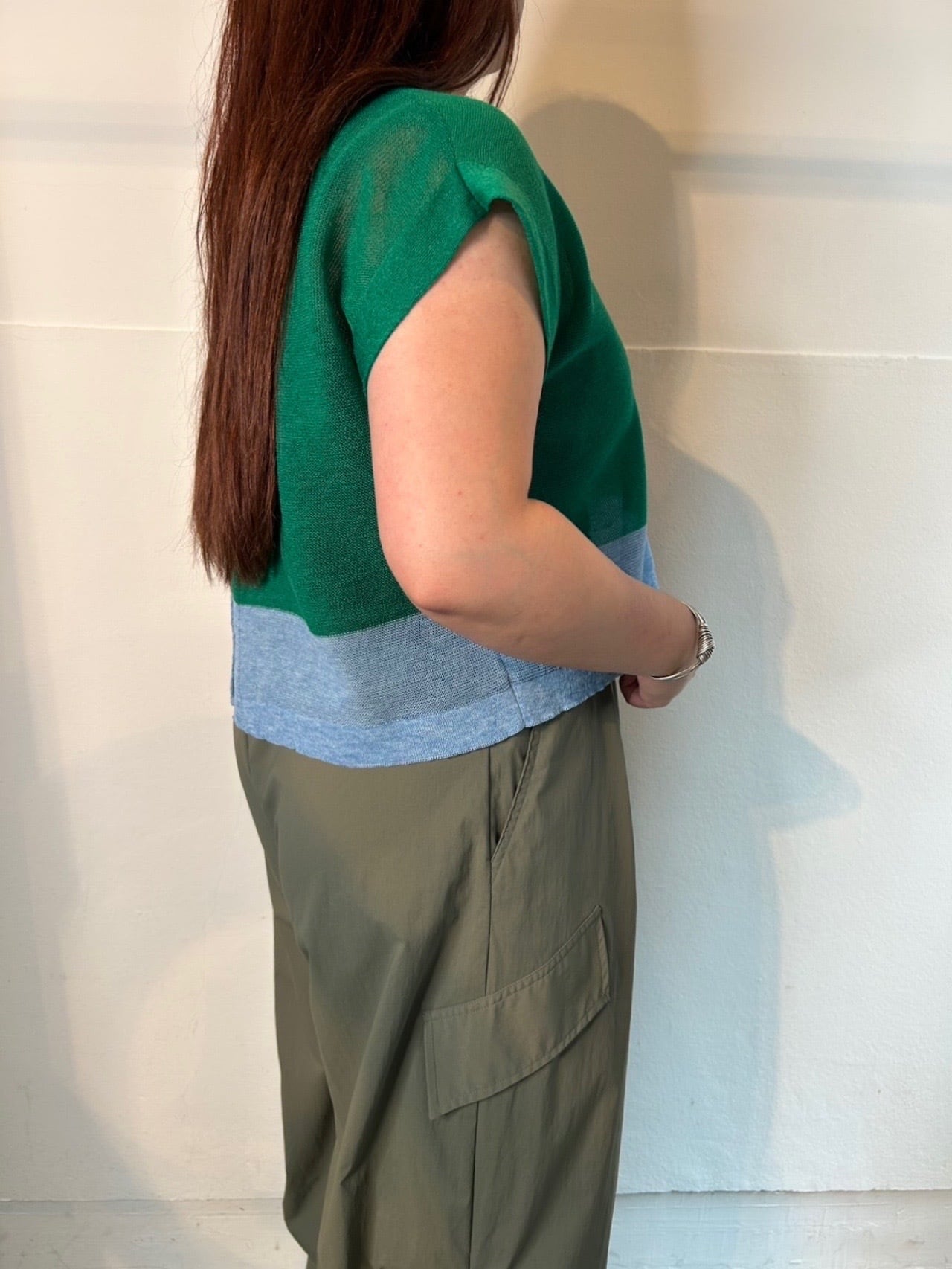 4月20日のインスタライブでご紹介したペーパーニット配色ショートジレ。麻とポリエステルを組み合わせたシャリ感が特徴のニット素材。紙のようなドライで肌離れの良いニットです。