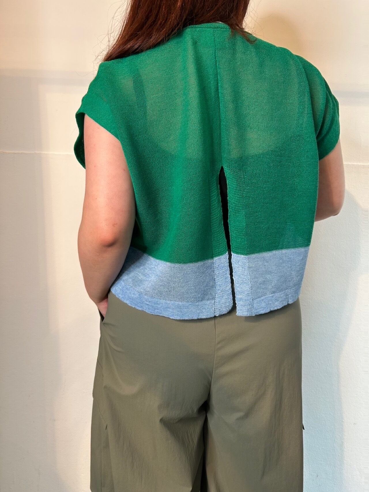 伸縮性◎ショート丈で重ね着にも◎裾の切替配色もポイントに。後ろ裾にスリットが入っています。